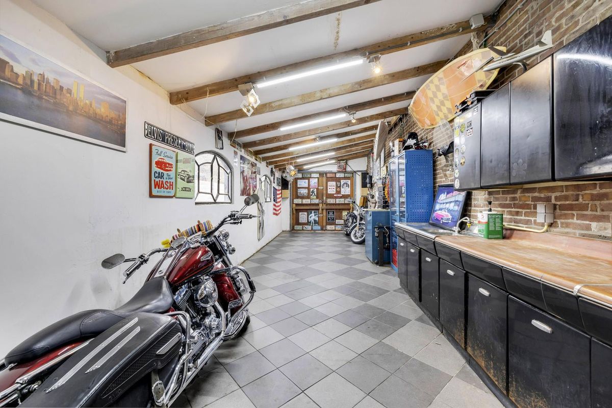 De zeer ruime en geïsoleerde garage met betonvloer beschikt over daglicht, elektra en openslaande inrij-deuren aan de voorzijde.