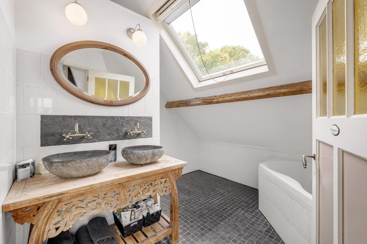 De moderne betegelde badkamer beschikt over een royale inloopdouche met regendouche, ligbad, dubbele wastafel, groot dakraam en elektrische vloerverwarming.