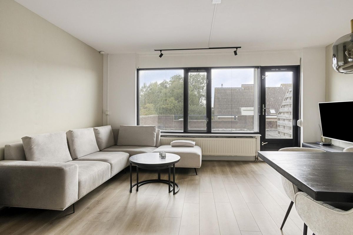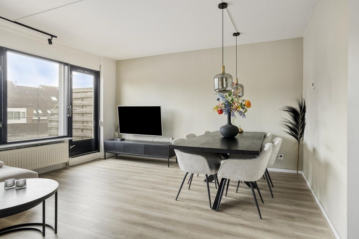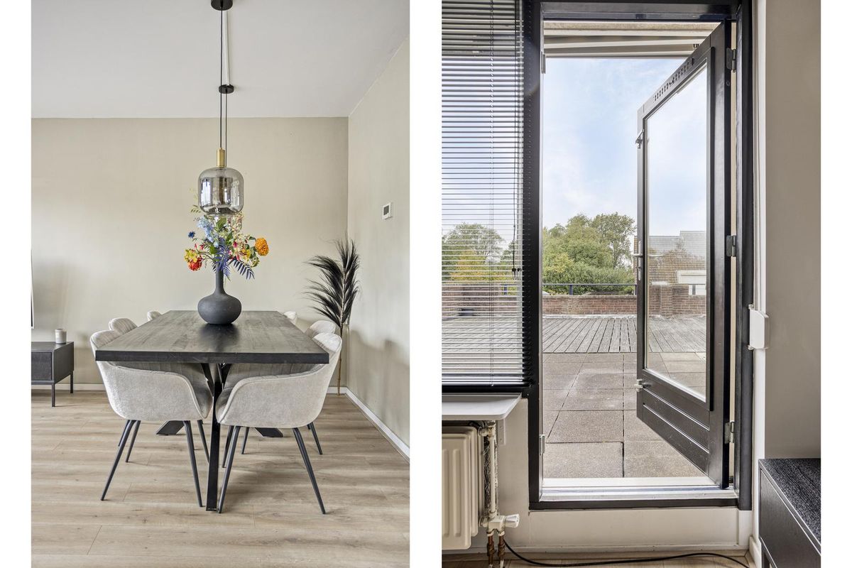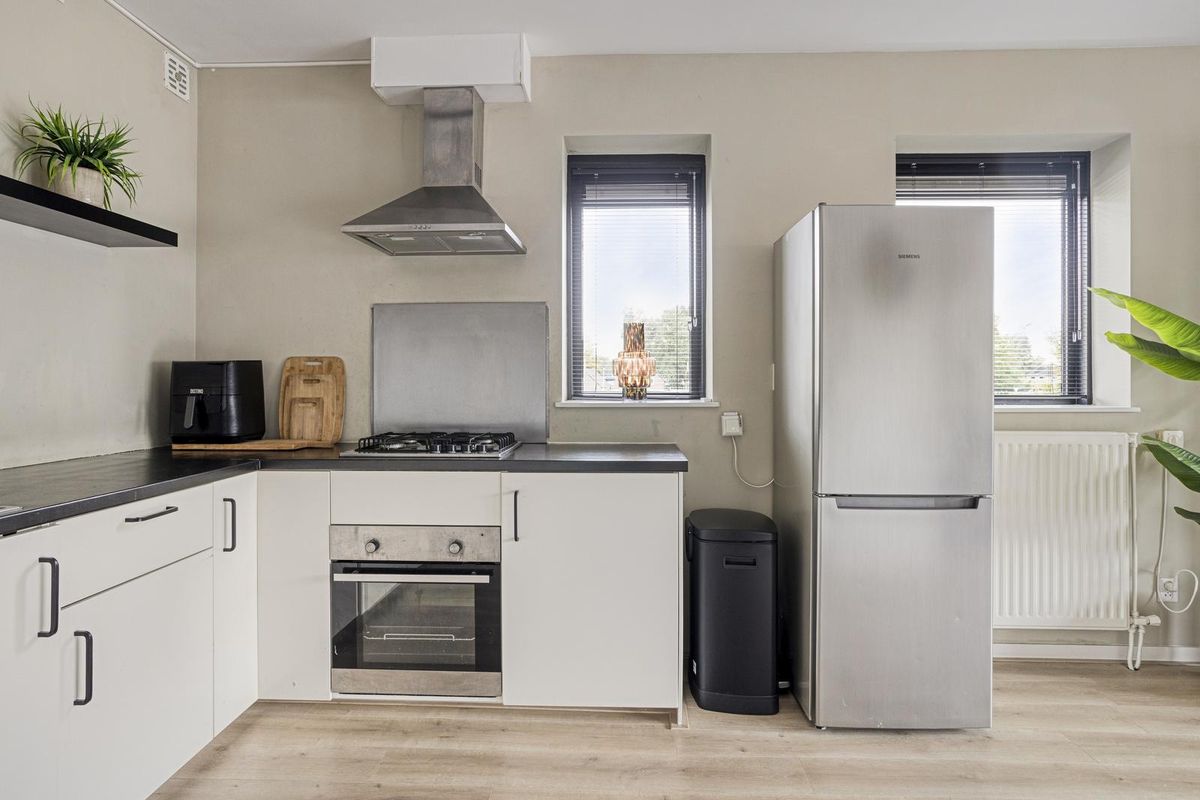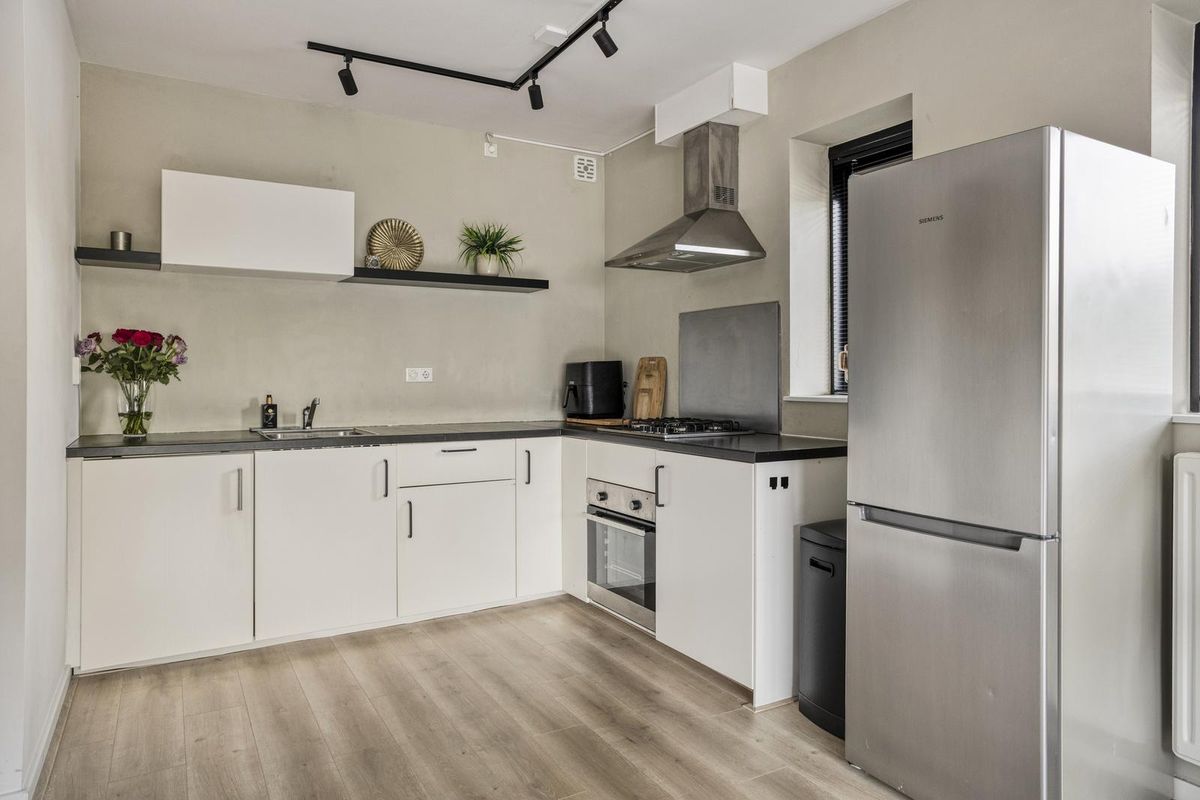 De woonkamer is modern en royaal van opzet, met een lichte vloer en beige wanden die zorgen voor een rustige, luxe uitstraling. Er is plek genoeg voor een gezellige hoekbank én een grote eettafel. Via de woonkamer stap je zo het dakterras op – jouw eigen buitenoase! De ruime keuken is voorzien van diverse inbouwapparatuur en biedt voldoende werk- en opbergruimte om jouw favoriete recepten tot leven te brengen.