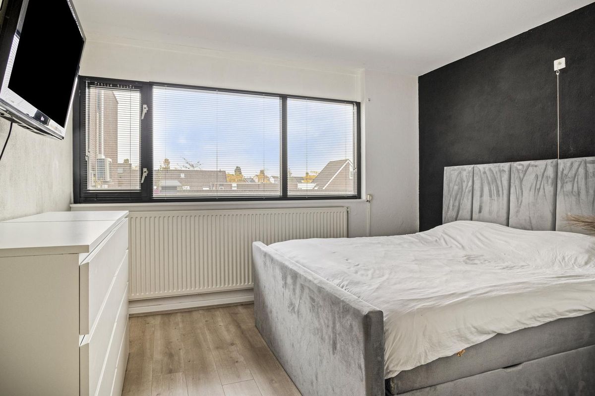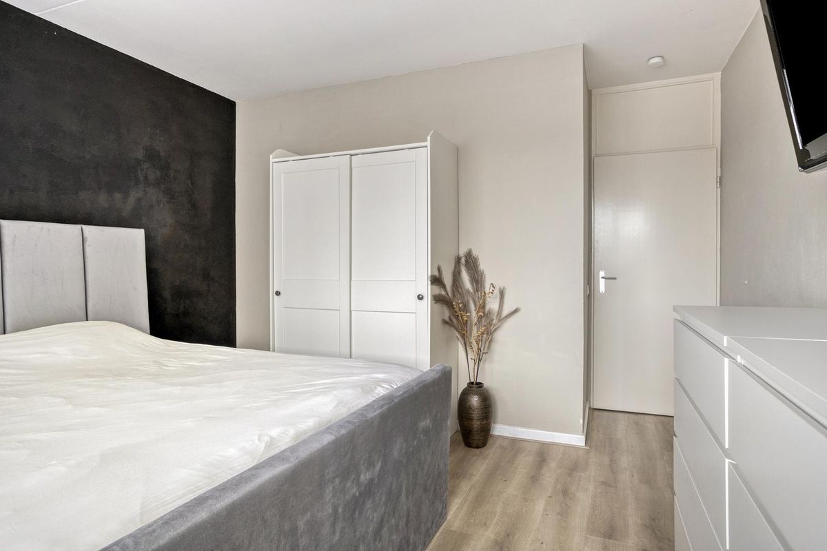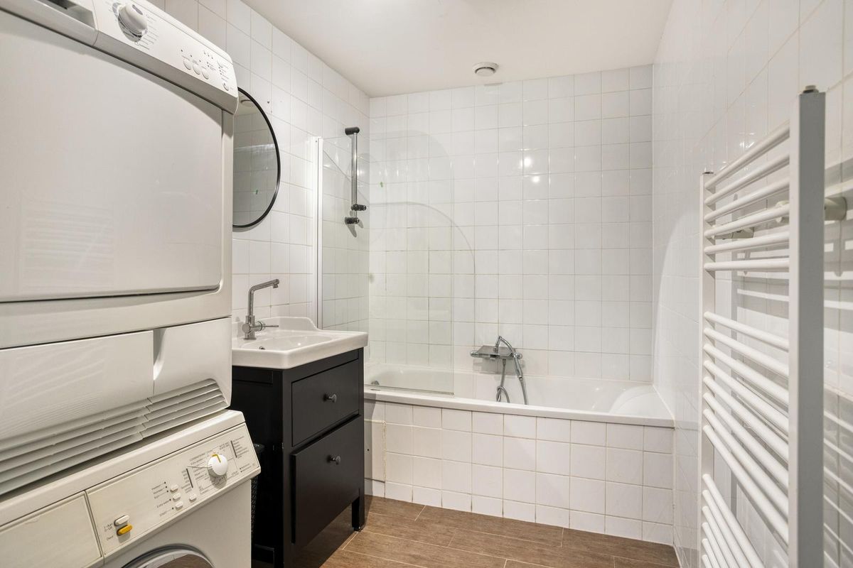 De slaapkamer is praktisch en stijlvol, met een strakke afwerking en lichte vloer. Er is ruimte voor een grote kledingkast en het voelt hier direct comfortabel aan. De badkamer is slim ingedeeld en voorzien van een bad met douchemogelijkheid, een wastafelmeubel, een designradiator en de aansluiting voor de wasmachine – alles wat je nodig hebt in één frisse ruimte.