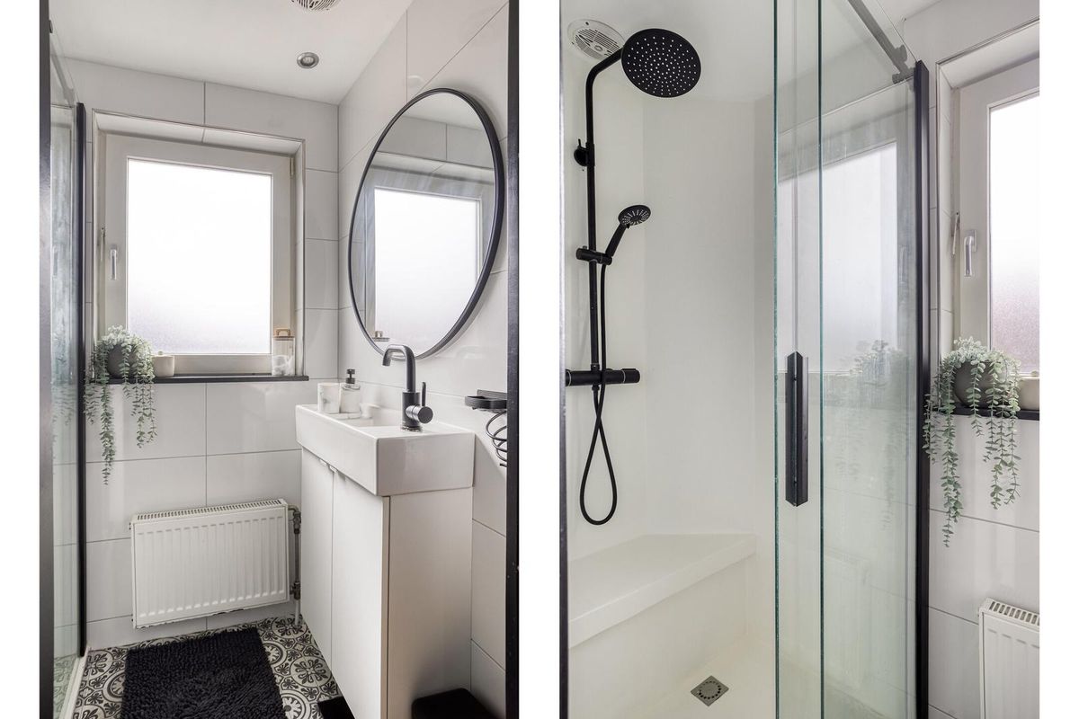 De badkamer is compact maar netjes, licht en praktisch in uitvoering, voorzien van een douche met (vernieuwde glazen) deur en een wastafel.