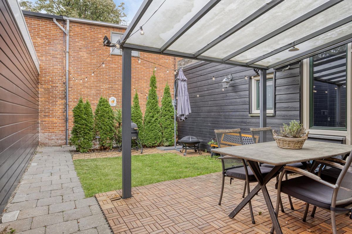 Via de keuken is de fijne achtertuin te bereiken. Deze is volledig besloten en daardoor voorzien van veel privacy. Hier is een fijne overkapping gerealiseerd om hier lekker te vertoeven. Er is een vrije achterom.