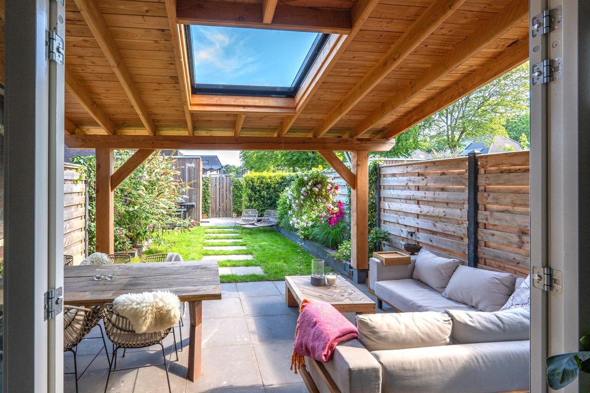 De tuin is verzorgd aangelegd en beschikt over een robuuste overkapping direct aan de achtergevel. Achterin de tuin staat een geïsoleerde berging met betonnen vloer en bitumen dakbedekking. Via een achterom is de tuin eenvoudig bereikbaar.