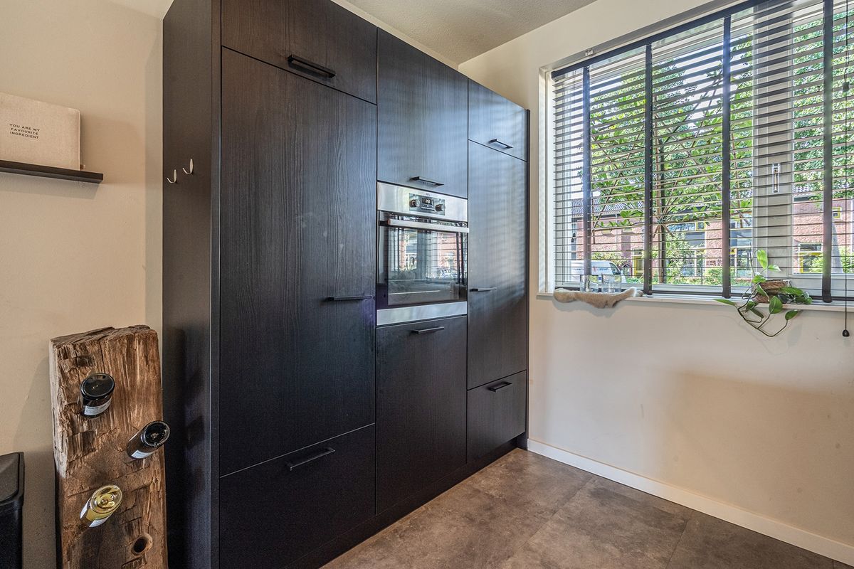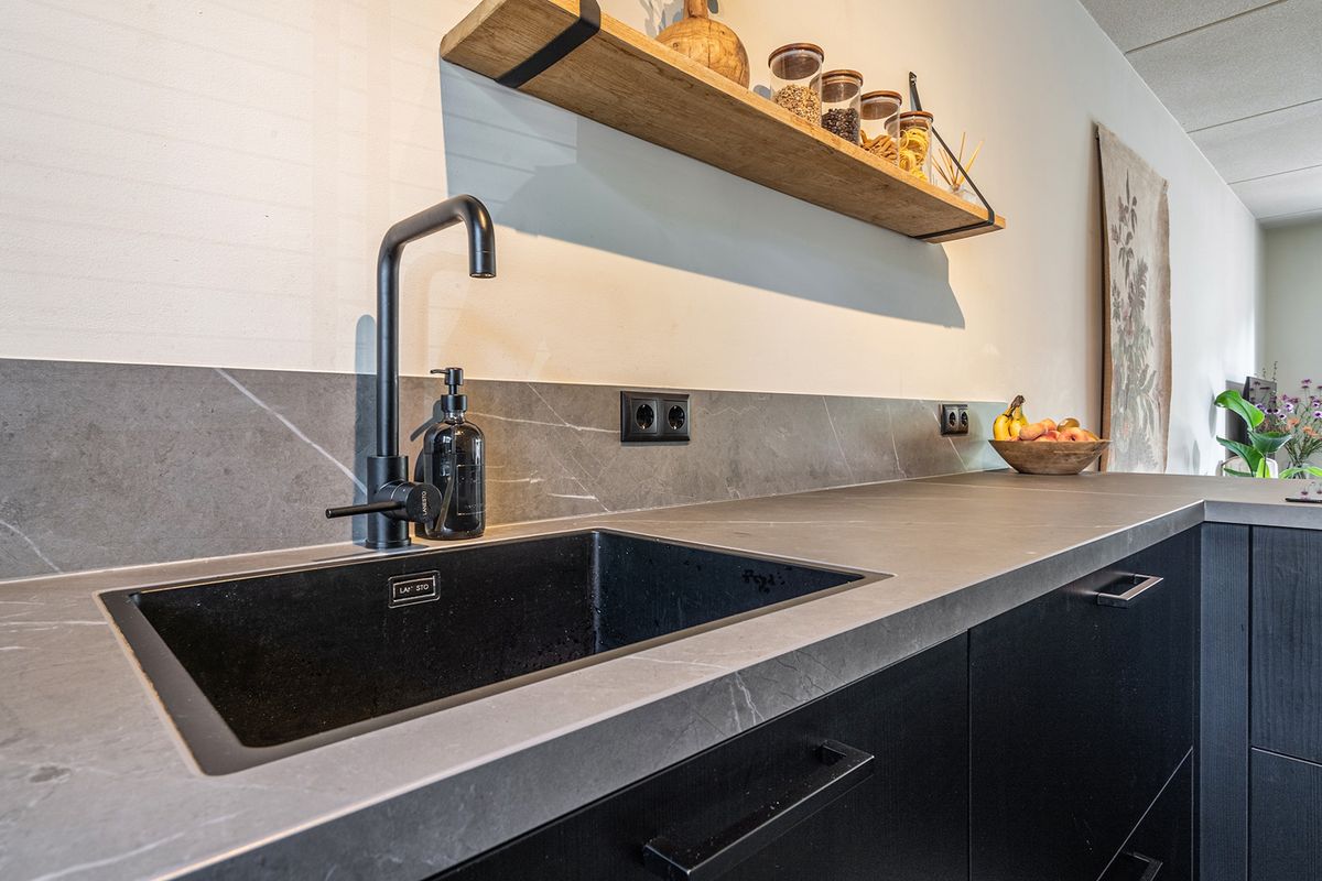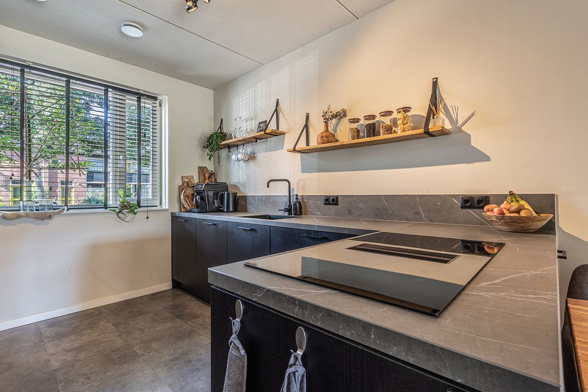 • Moderne woonkeuken in L-opstelling met kastenwand, luxe inbouwapparatuur (vaatwasser, oven, koelkast, vriezer, elektrische kookplaat met afzuiging)
