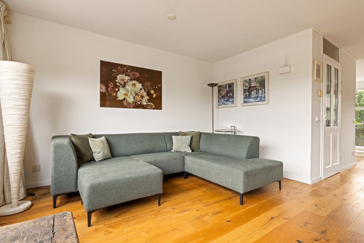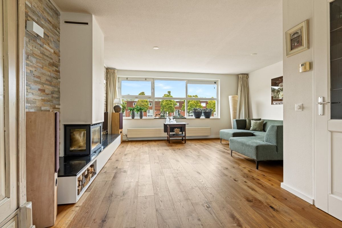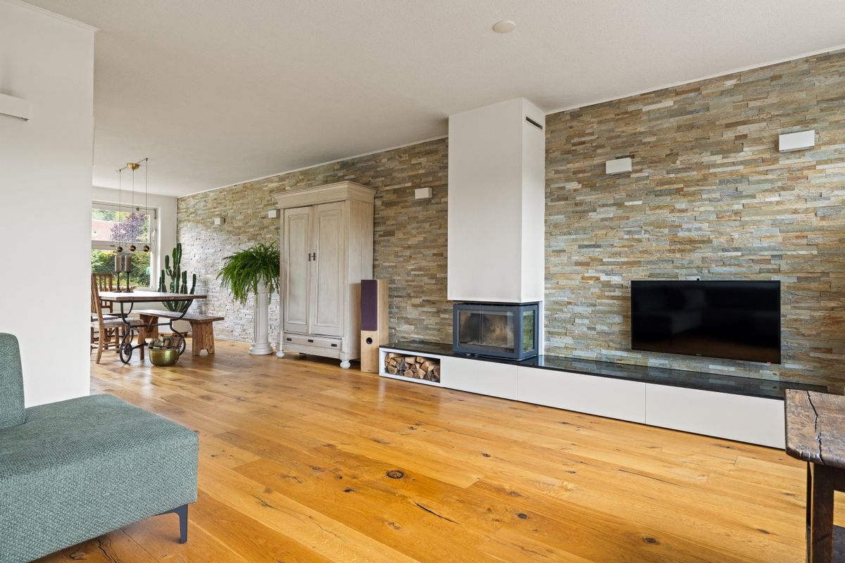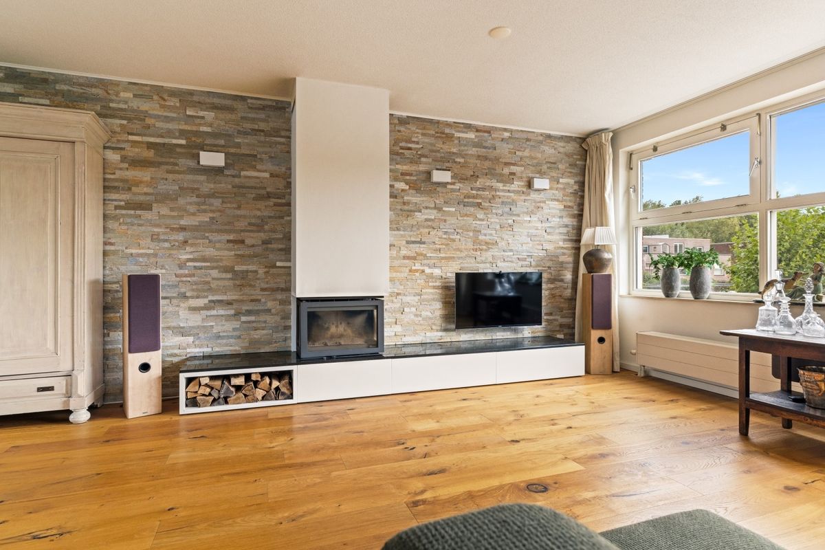 Middels de trap bereikt u de eerste etage. Hier komt u binnen in de hal, die toegang geeft tot de ruime woonkamer van ca. 42 m² met grote raampartijen en een schitterend uitzicht op het water. De vide zorgt ook hier voor een uniek en open karakter. De woonkamer is voorzien van een sfeervolle houthaard, perfect voor gezellige avonden in de koudere maanden. Daarnaast biedt de ruimte volop plek voor een comfortabele zithoek en een werkplek aan huis.