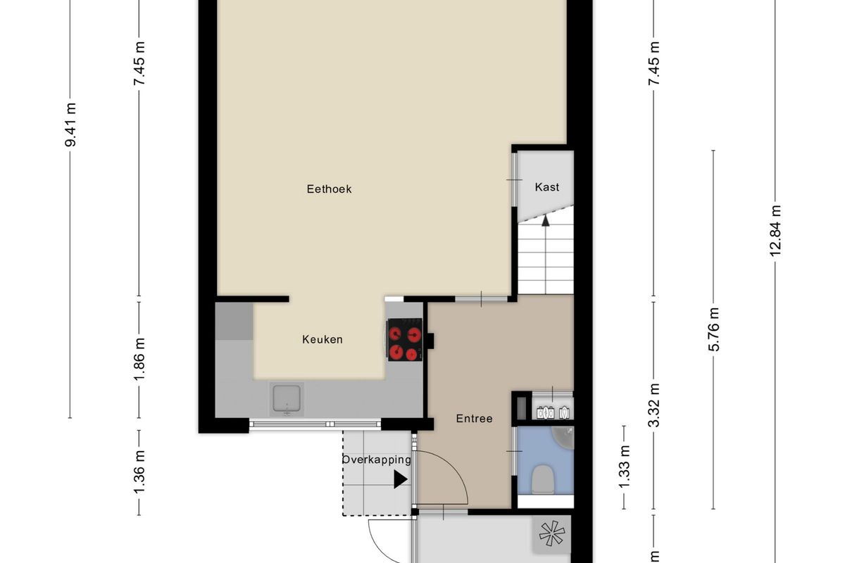 Begane grond: entree, hal met meterkast, toilet met een fonteintje, trapkast, ruime woonkamer, moderne keuken met diverse inbouwapparaten en een schuifpui/ loopdeur naar de diepe achtertuin (N) met vrijstaande stenen berging en achterom. Tevens is er aan de voorzijde een inpandige berging.