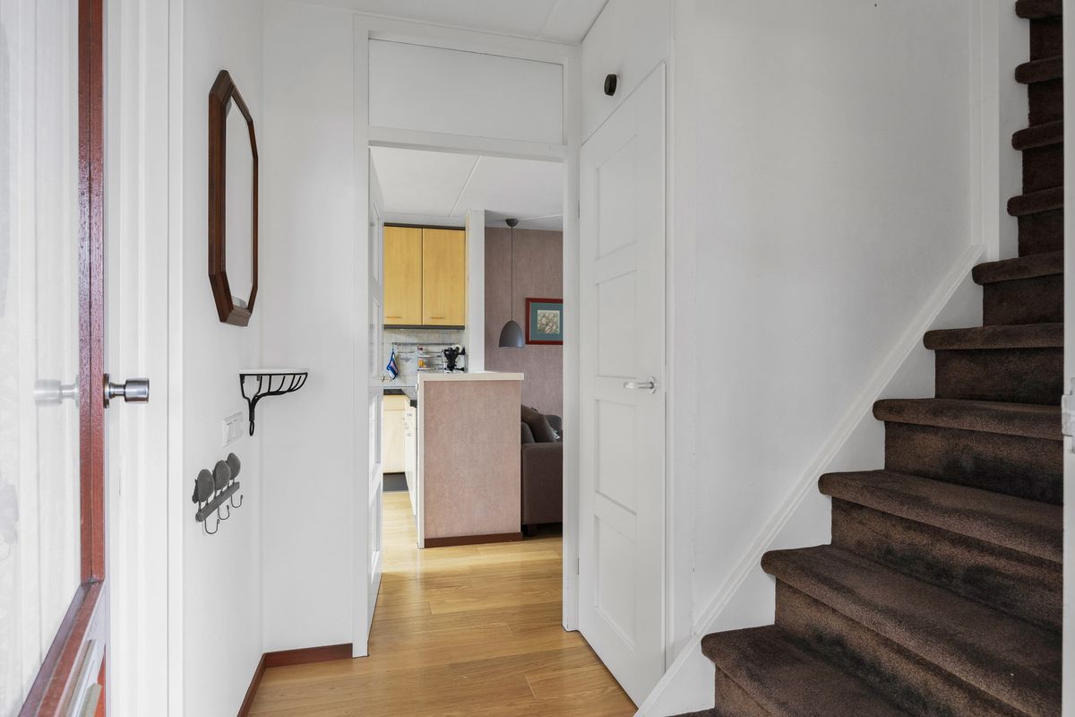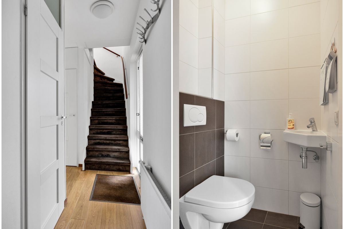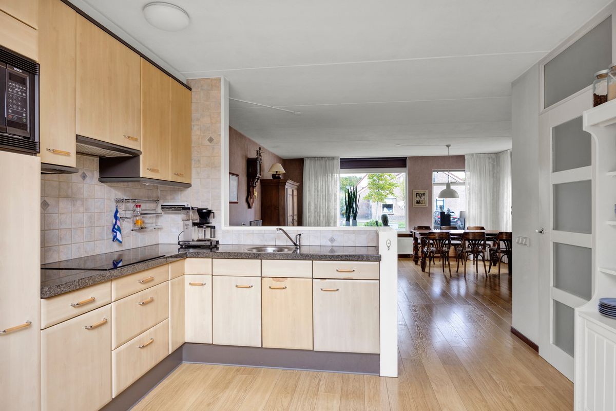 De auto parkeren we op de oprit aan de voorzijde, het is echter ook mogelijk de auto aan de achterzijde op eigen erf te parkeren. We betreden de woning via de voordeur en komen in de hal met trapopgang, meterkast en toilet, rechts van de hal bevindt zich de bijkeuken met aansluiting voor de wasmachine en droger, de technische installatie en een spoelbak, tevens toegang tot de achtertuin. Rechtdoor in de hal kom je in de woonkamer met open keuken met hoekopstelling welke voorzien is van diverse inbouwapparatuur zoals; koelkast, combimagnetron, keramische kookplaat en afzuigkap. Vanuit de keuken stap je door de dubbele openslaande deuren zo de achtertuin op het zuiden in.