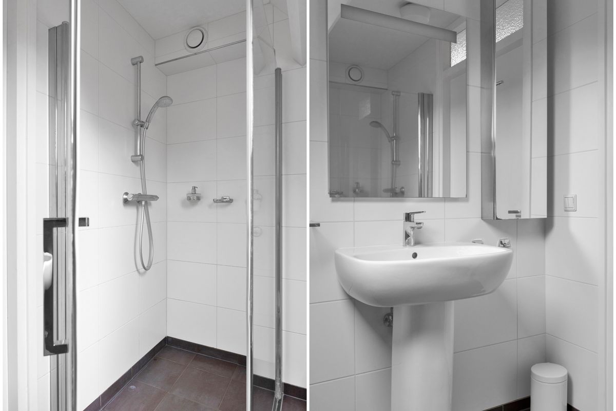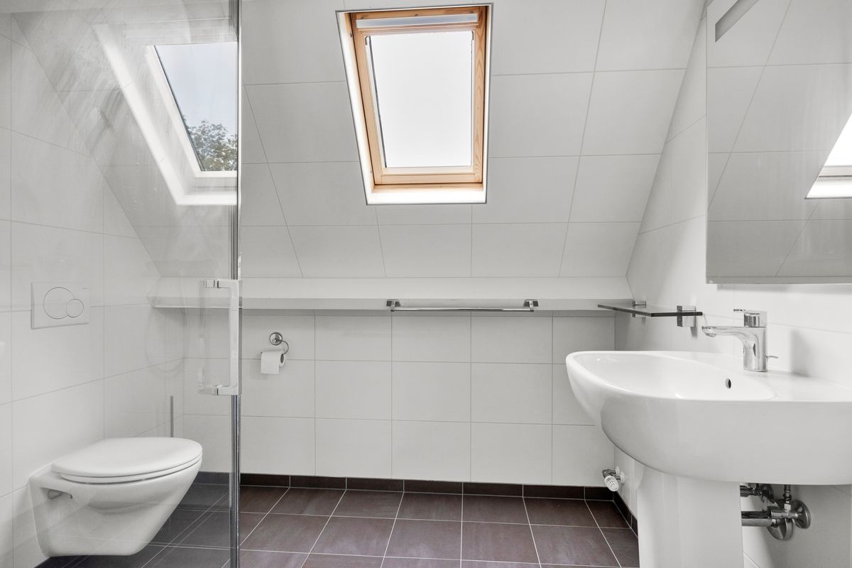 De overloop geeft toegang tot de badkamer met vloerverwarming, douche, 2 toilet en wastafel, en de 2 slaapkamers waarvan de riante master bedroom inbouwkasten heeft.