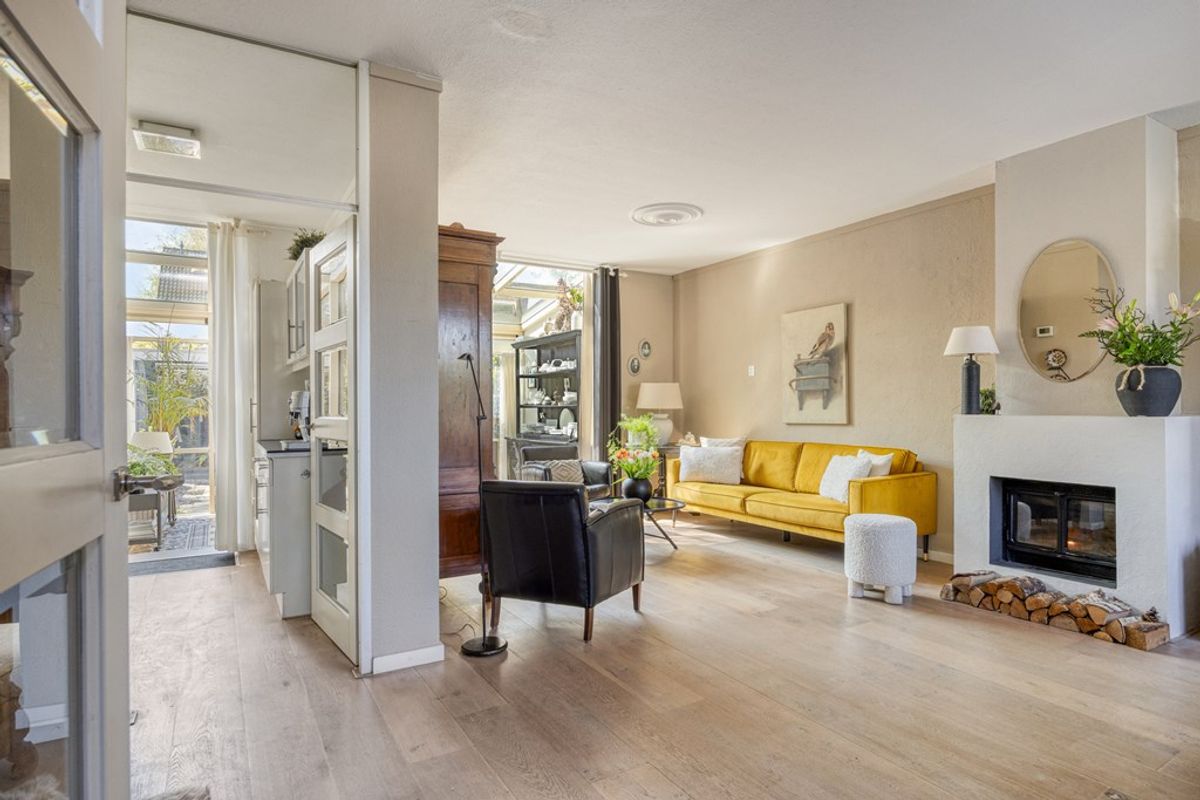 Je komt binnen in de nette hal met toilet en toegang tot de royale woonkamer. De sfeervolle houten vloer en de open haard geven direct warmte en karakter. De woonkamer loopt prachtig over in de serre, met vloerverwarming, waar de Portugese tegels zorgen voor een unieke uitstraling. Dankzij de openslaande deuren haal je buiten moeiteloos naar binnen en geniet je optimaal van het tuinleven.