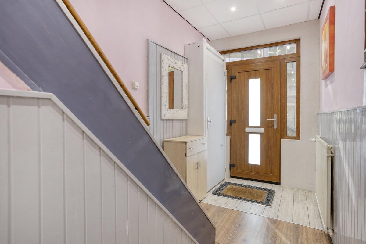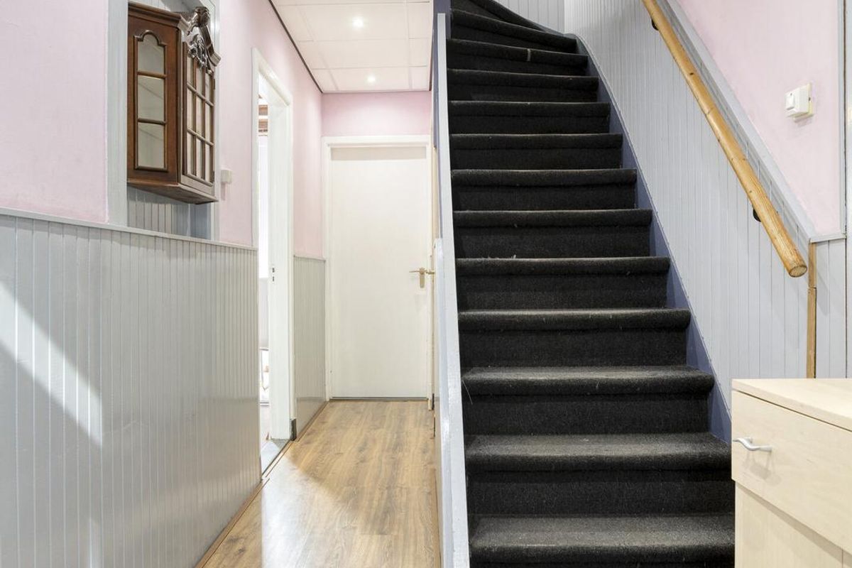 Bij binnenkomst komt u in de hal met trapopgang naar de eerste verdieping. Hier bevinden zich het toilet, de garderobe en de deuren naar de woonkamer en de keuken.