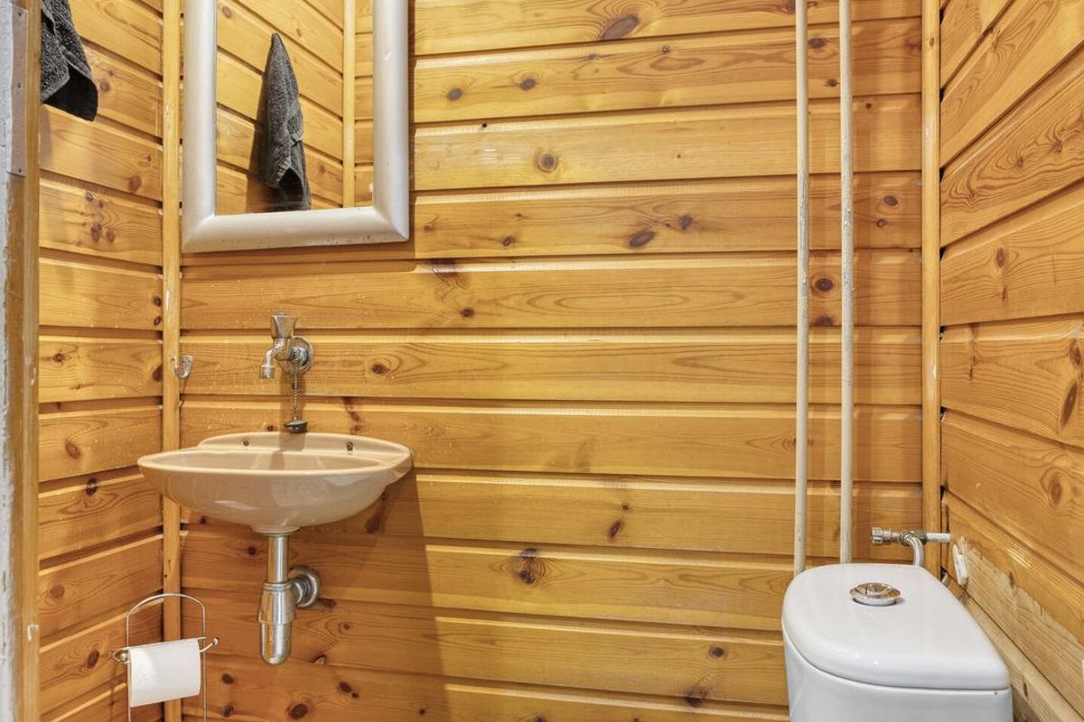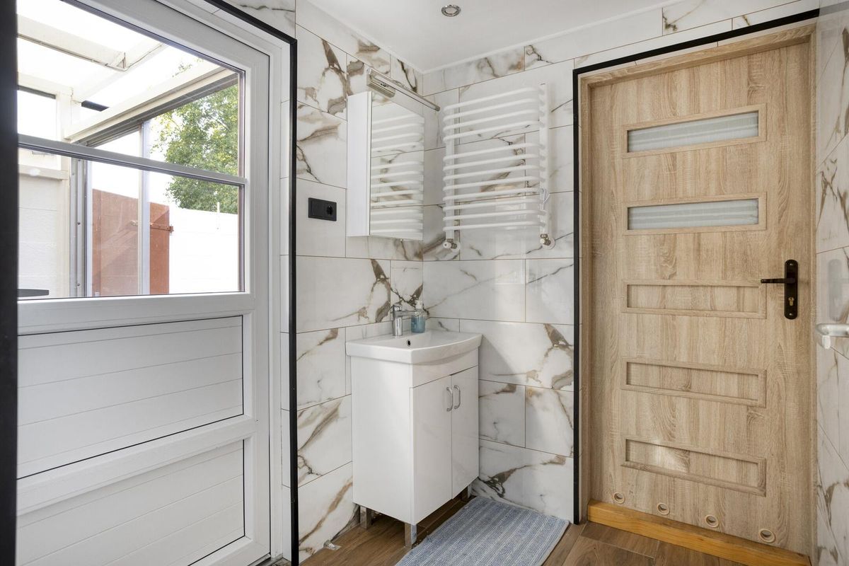 Achter de keuken bevindt zich een tweede hal met een wastafel en vier deuren: naar de keuken, naar het terras (met toegang tot de twee garages), naar een kleine badkamer met toilet en naar een slaapkamer. Deze slaapkamer op de begane grond kan naar wens ook worden ingericht als werkkamer of hobbyruimte.