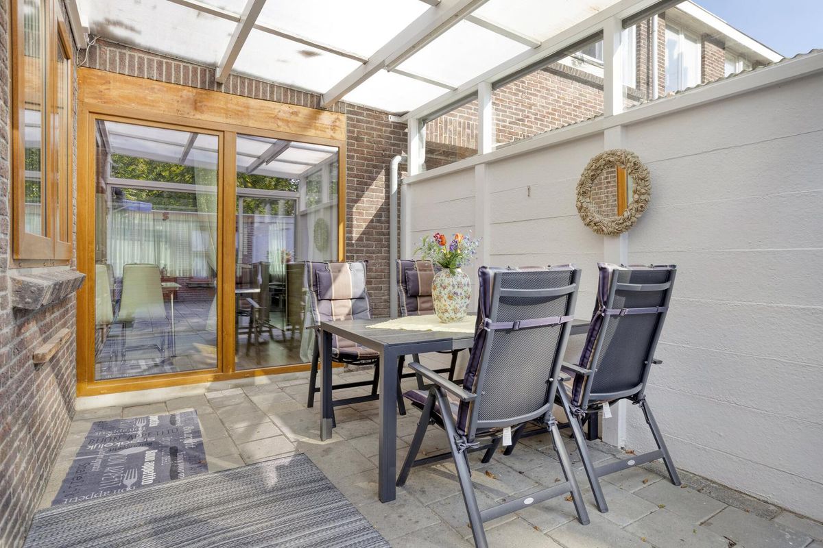 Aan de achterzijde van de woonkamer bevindt zich een grote schuifpui naar de tuin. De tuin is grotendeels betegeld en beschikt over een overkapping en een achterom. Achter de woning liggen twee ruime garages, waarvan één met een kanteldeur. Beide bieden ruimte voor een auto of kunnen gebruikt worden als berging of werkplaats.