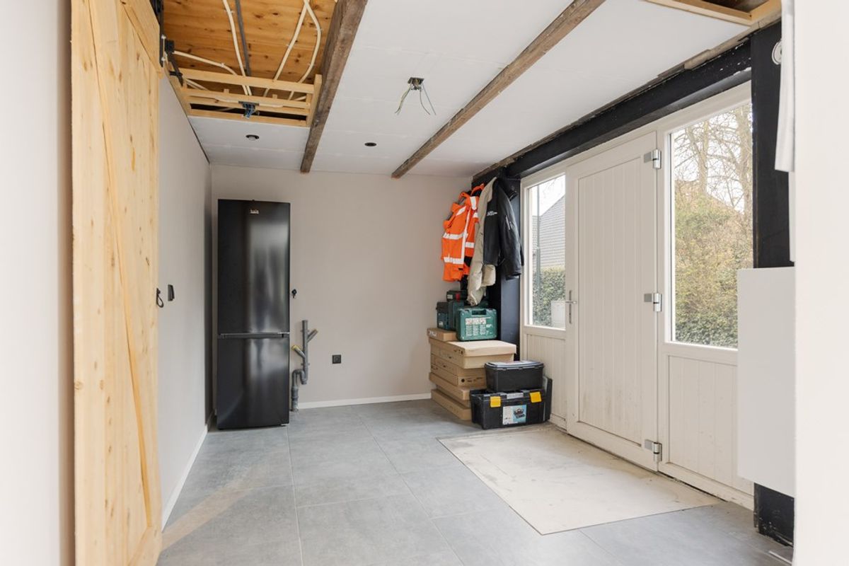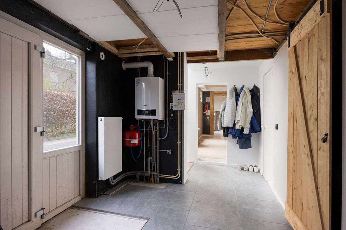 Begane grond: Entree, hal, woonkamer met trapopgang naar verdieping, open keuken voorzien van inductiekookplaat, afzuigkap, combi-oven, koelkast vaatwasser, badkamer, bijkeuken.