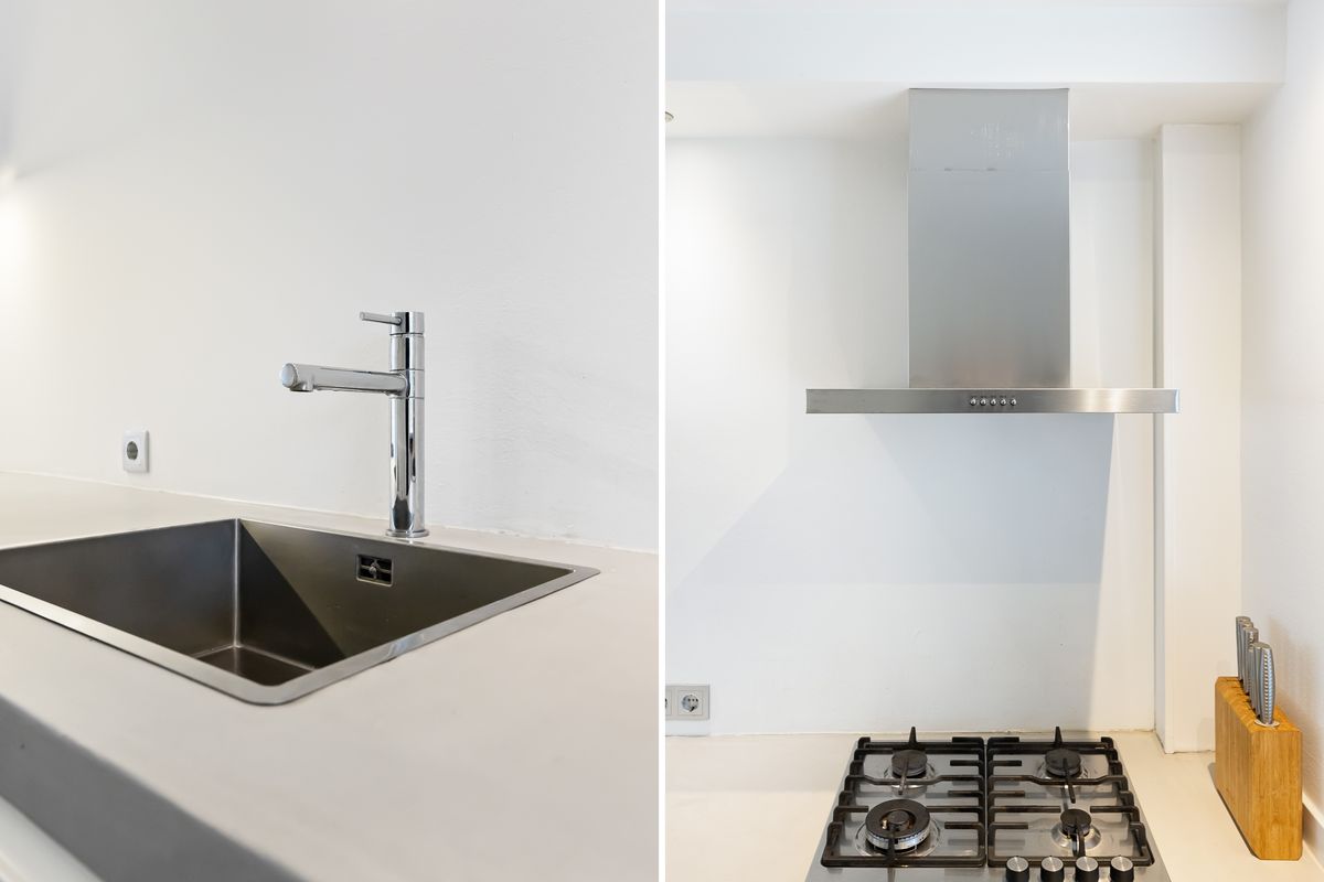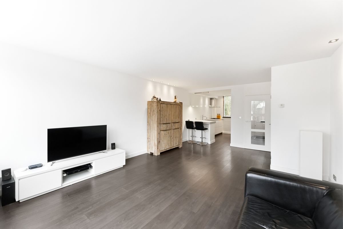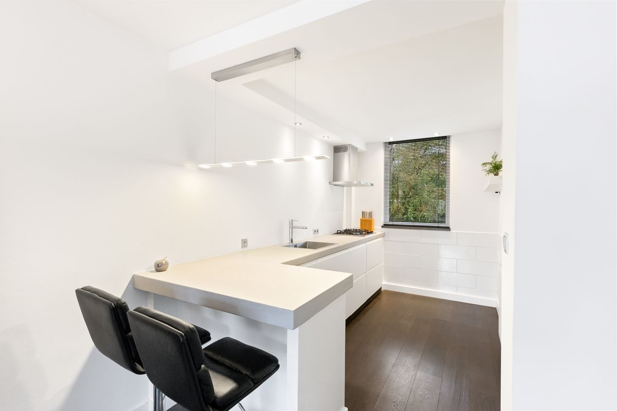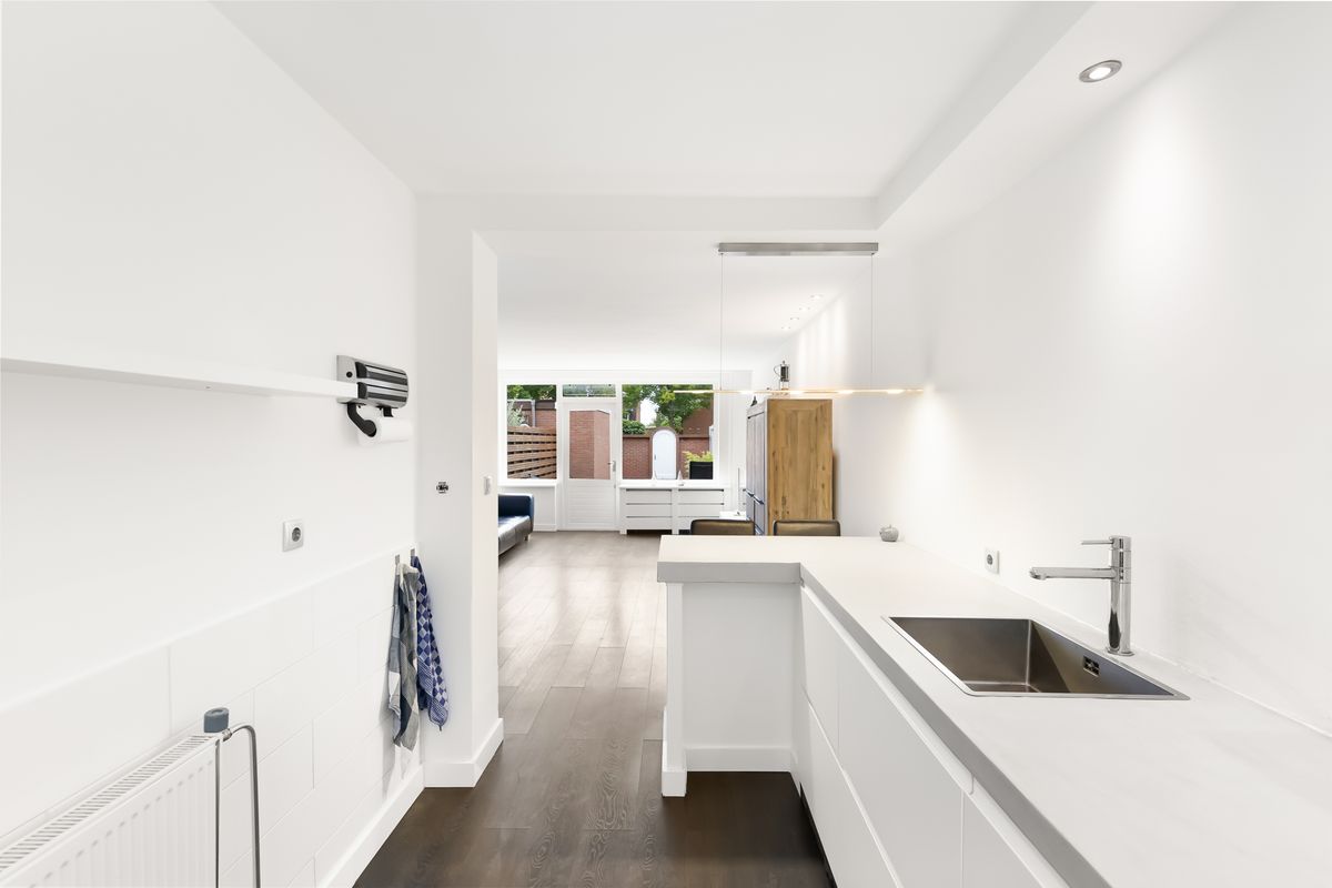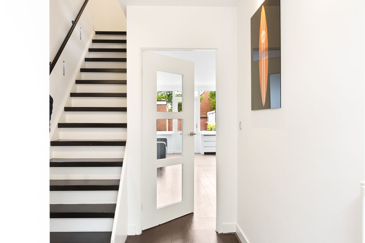 Entree met hal, toilet en de trapopgang naar de eerste verdieping. De lichte woonkamer is tuingericht en voorzien van toegang tot de achtertuin. Teven treft u hier de praktische trapkast. De open keuken met barretje is modern afgewerkt met een gaskookplaat, afzuigkap, koelkast en betonnen werkblad.