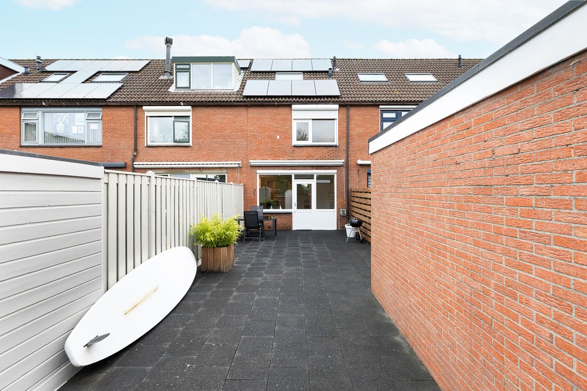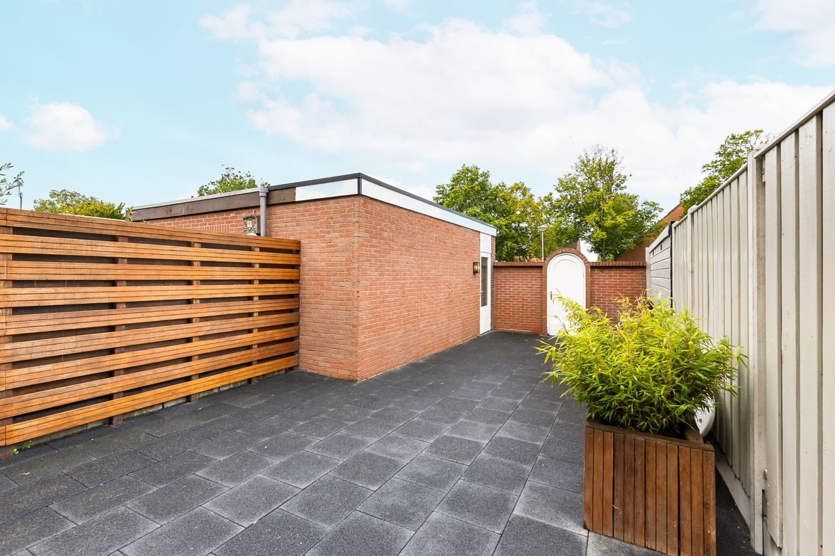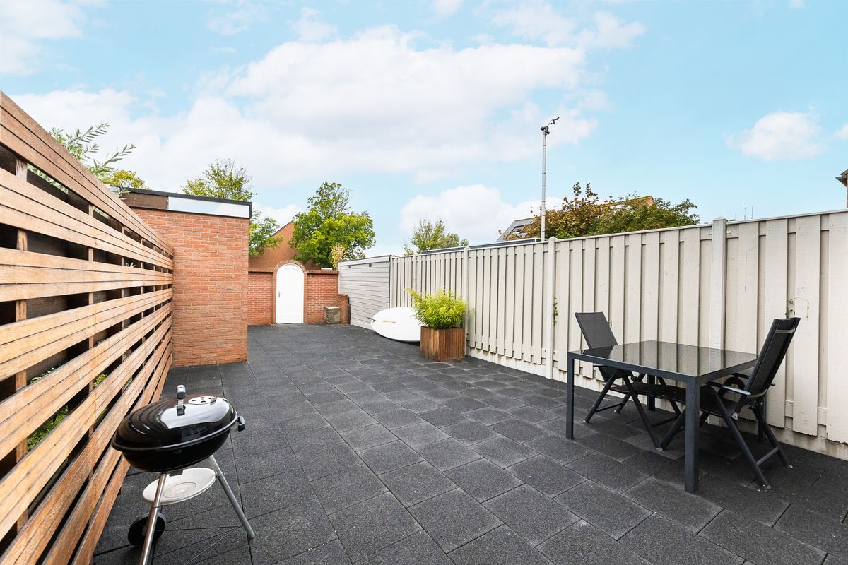 Zonnige, onderhoudsvriendelijke achtertuin met (fietsen)berging en vrije achterom.