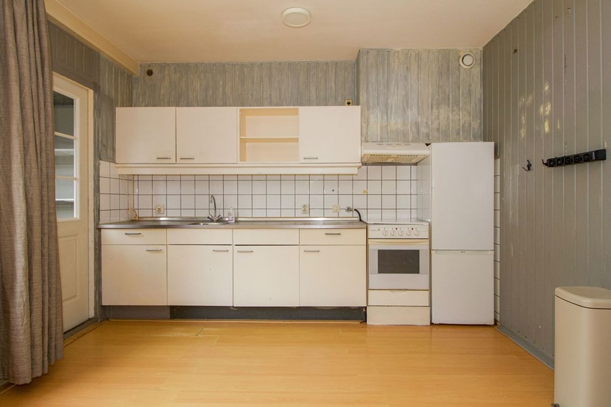 De woonkamer staat in open verbinding met de keuken, welke aan de achterzijde van de woning is gelegen. De keuken is praktisch ingericht en biedt voldoende ruimte voor een royale opstelling. Vanuit de keuken bereikt u via een aparte hal de achterdeur naar de tuin.