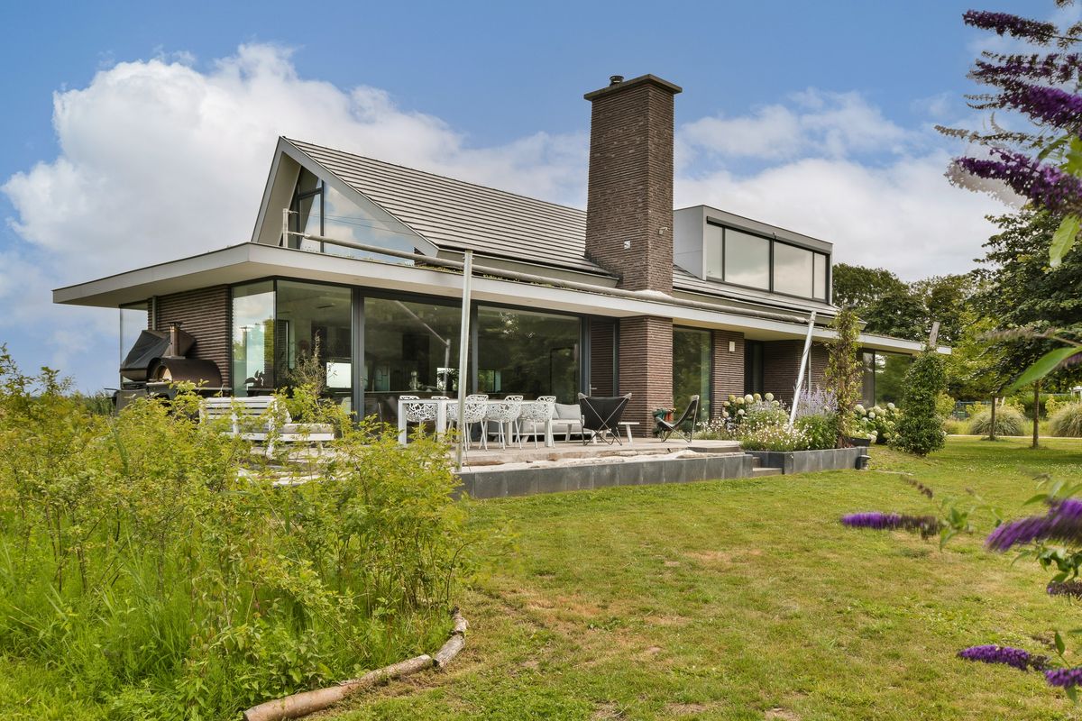 De villa is gelegen op een indrukwekkend perceel van ruim formaat, omringd door weilanden en natuur. Grote raampartijen zorgen voor een prachtig panoramisch uitzicht en halen het buitenleven naar binnen. Vanuit de woonkamer, de keuken én de werkkamer boven geniet u elke dag opnieuw van het wisselende landschap.