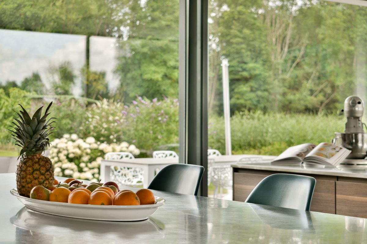 Via de riante entreehal betreedt u de lichte en ruime woonkamer met sfeervolle haard en prachtig uitzicht over de tuin en het achtergelegen landschap. De luxe open keuken met dubbel kookeiland is volledig uitgerust en grenst aan een praktische bijkeuken.