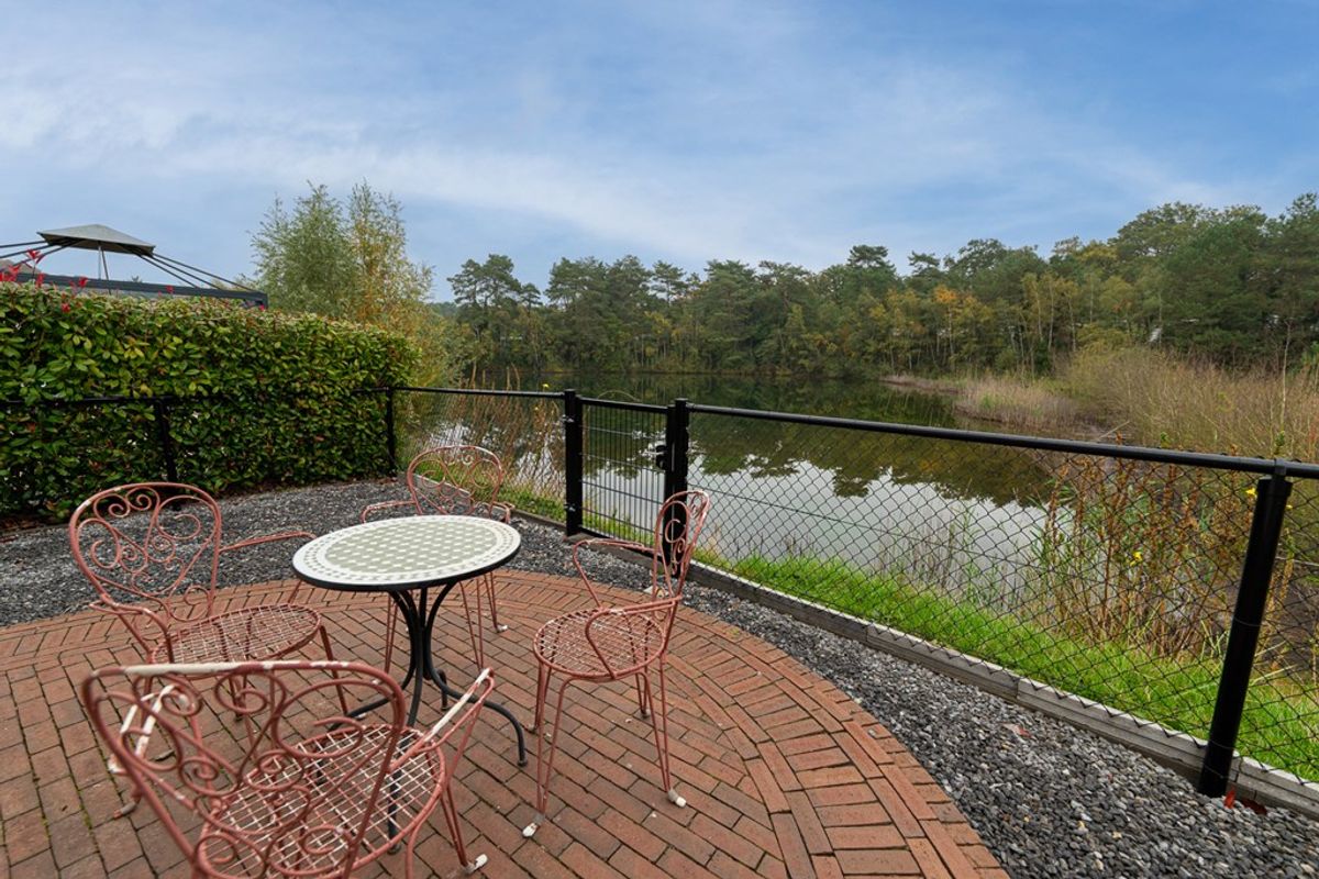 De tuin ligt op het zuidoosten, waardoor je de hele dag zon hebt. Een elektrisch zonnescherm biedt schaduw op warme dagen. Het omheinde terras aan het water vormt een oase van rust met uitzicht op de groene bomen en het glinsterende water.