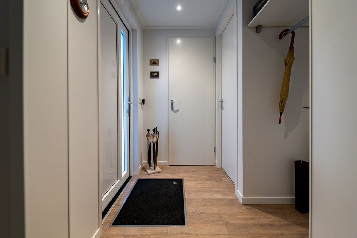 Bij binnenkomst stap je in een lichte hal met een moderne laminaatvloer (drempelloos doorgelegd, behalve in badkamer en slaapkamer). Direct naast de entree bevindt zich een gastentoilet met fontein.