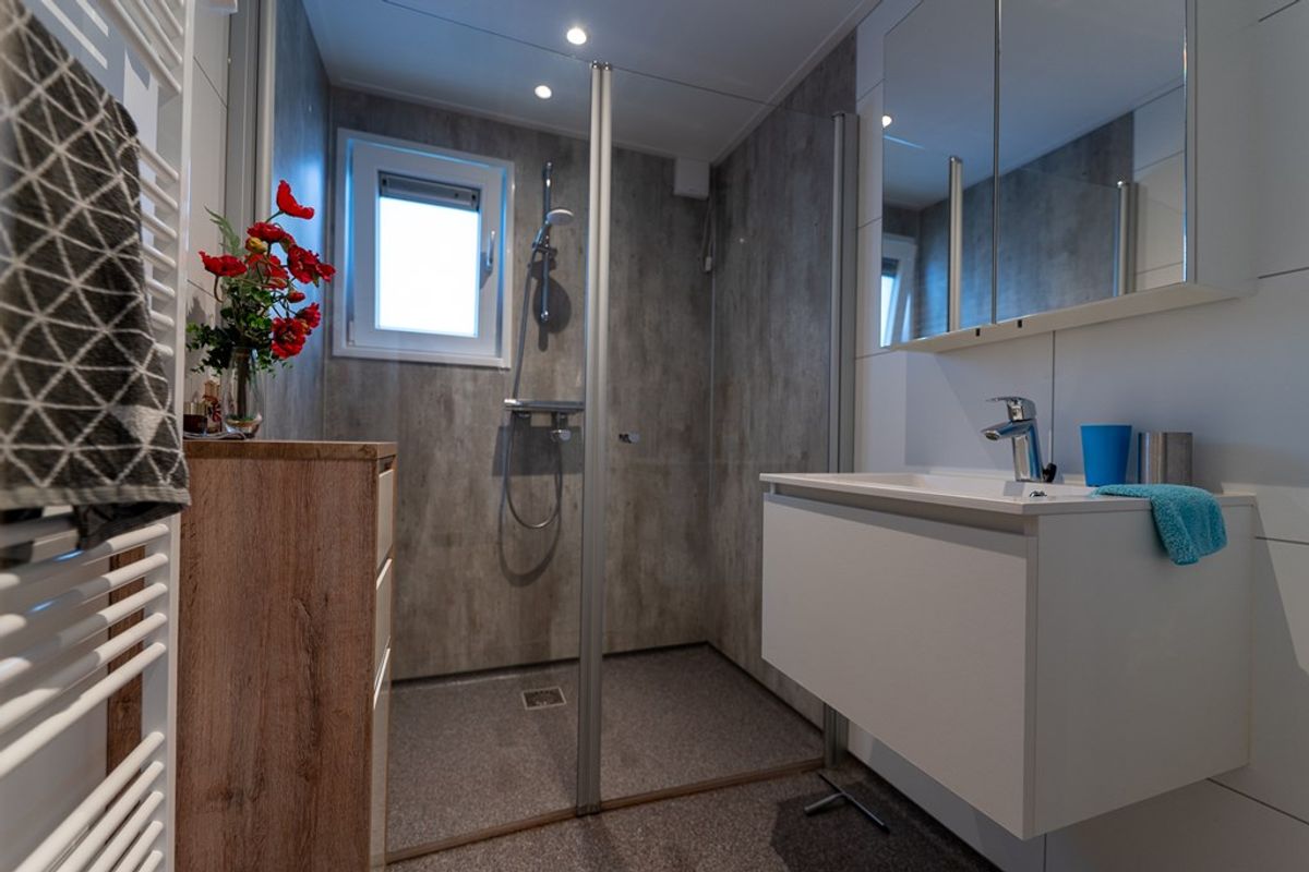 De badkamer is volledig betegeld en uitgerust met een ruime inloopdouche, modern wastafelmeubel en designradiator – een fijne plek om de dag fris te beginnen of ontspannen af te sluiten.
