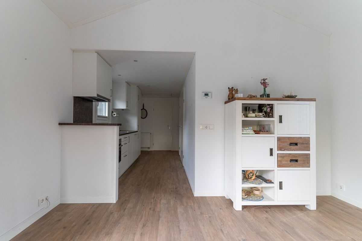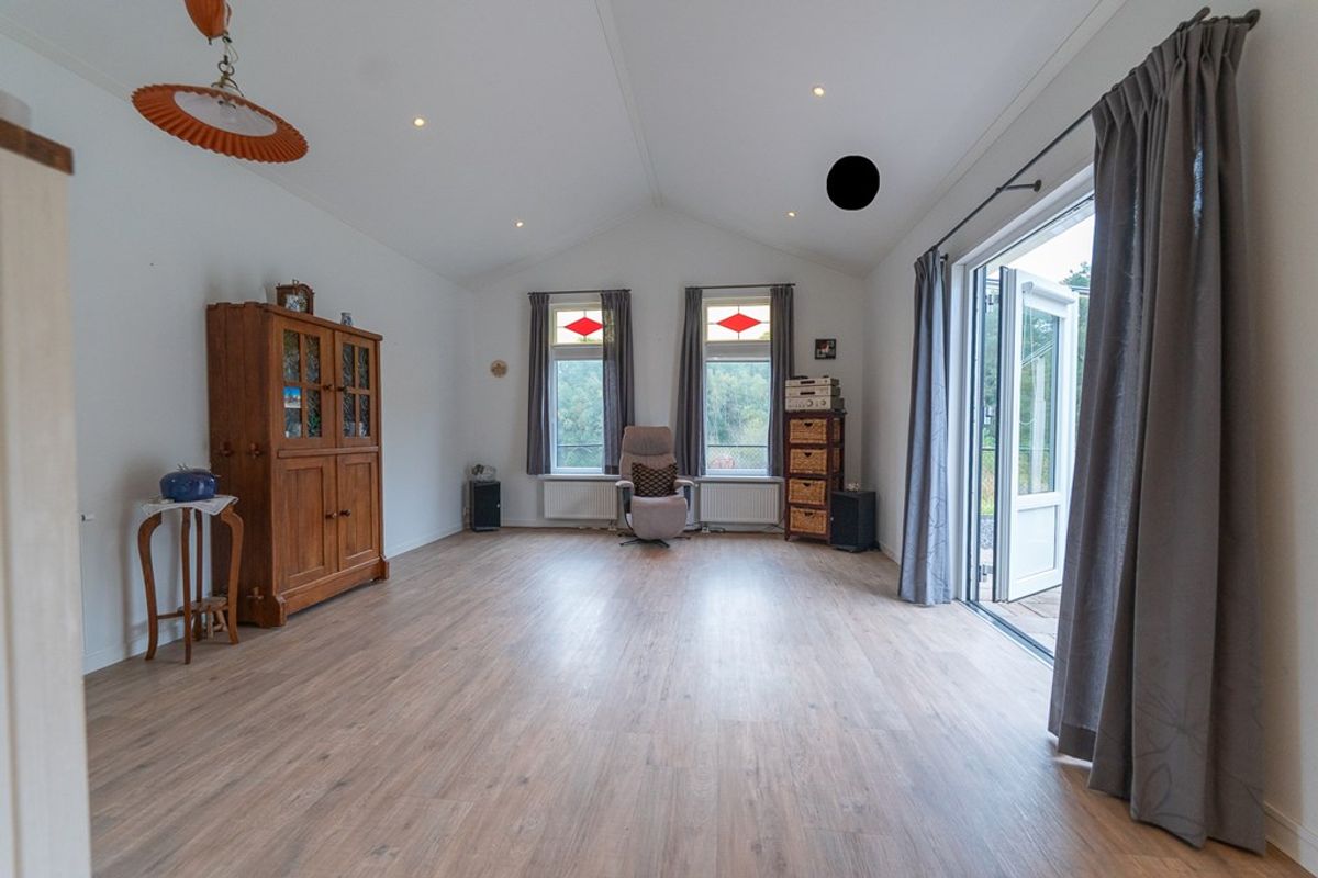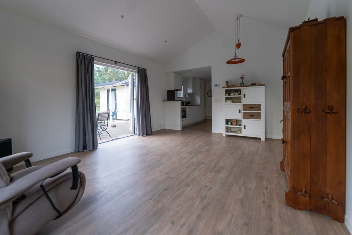 De ruime woonkamer biedt plaats voor een gezellige zithoek en eettafel. Grote raampartijen en openslaande deuren zorgen voor veel lichtinval en directe toegang tot het zonnige terras met uitzicht over het water – een heerlijke plek om te genieten van rust, natuur en het kabbelende water.