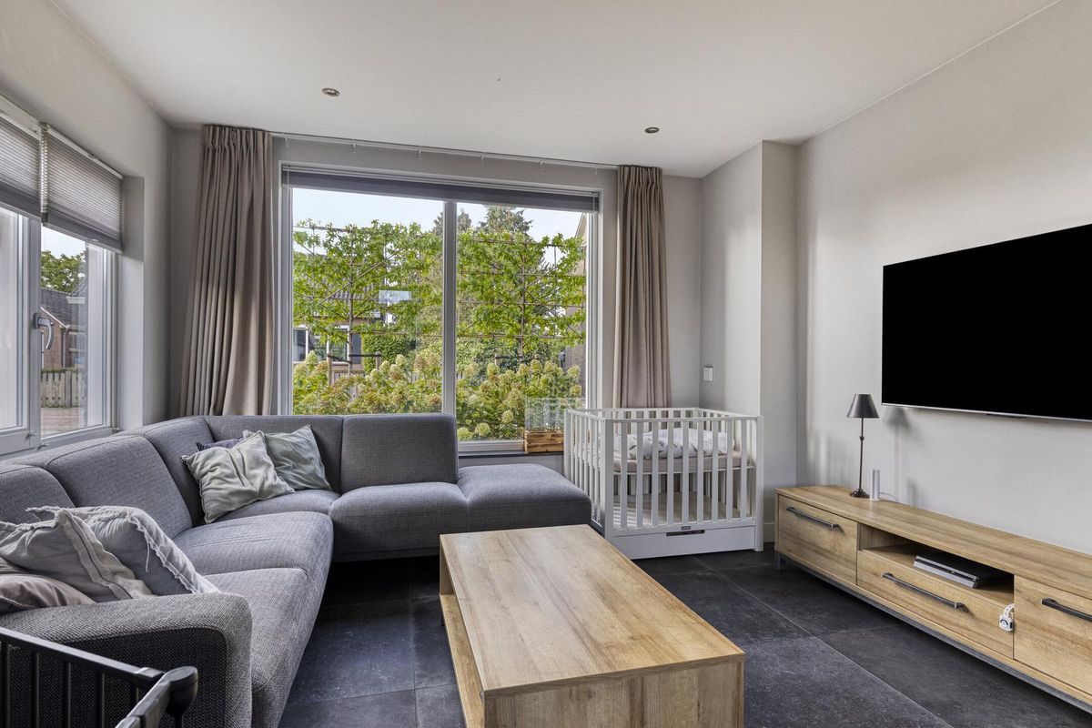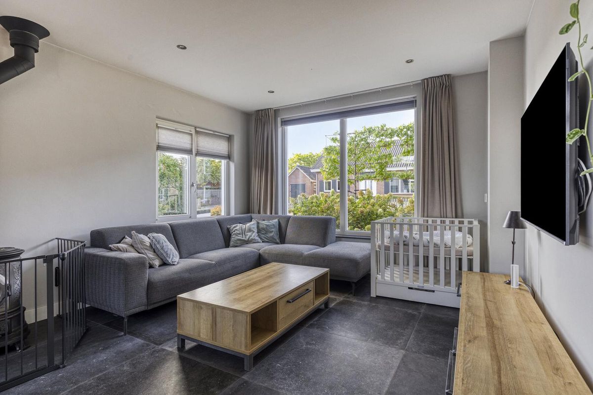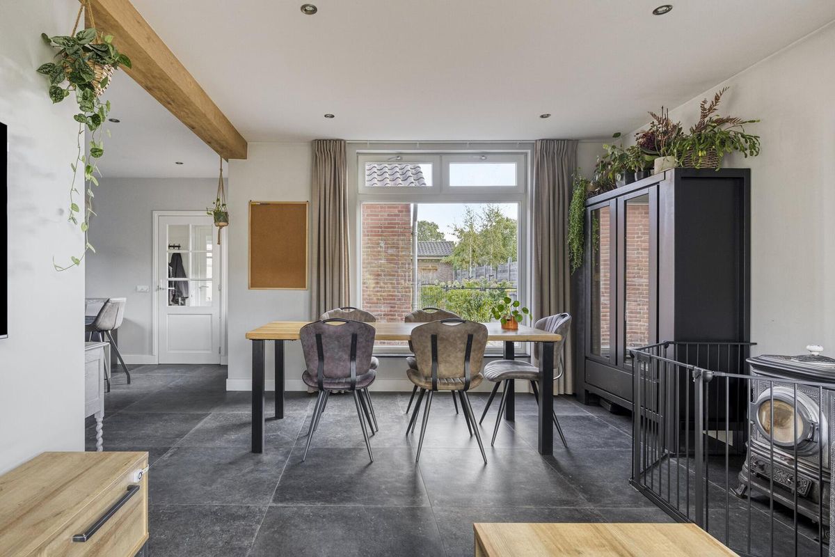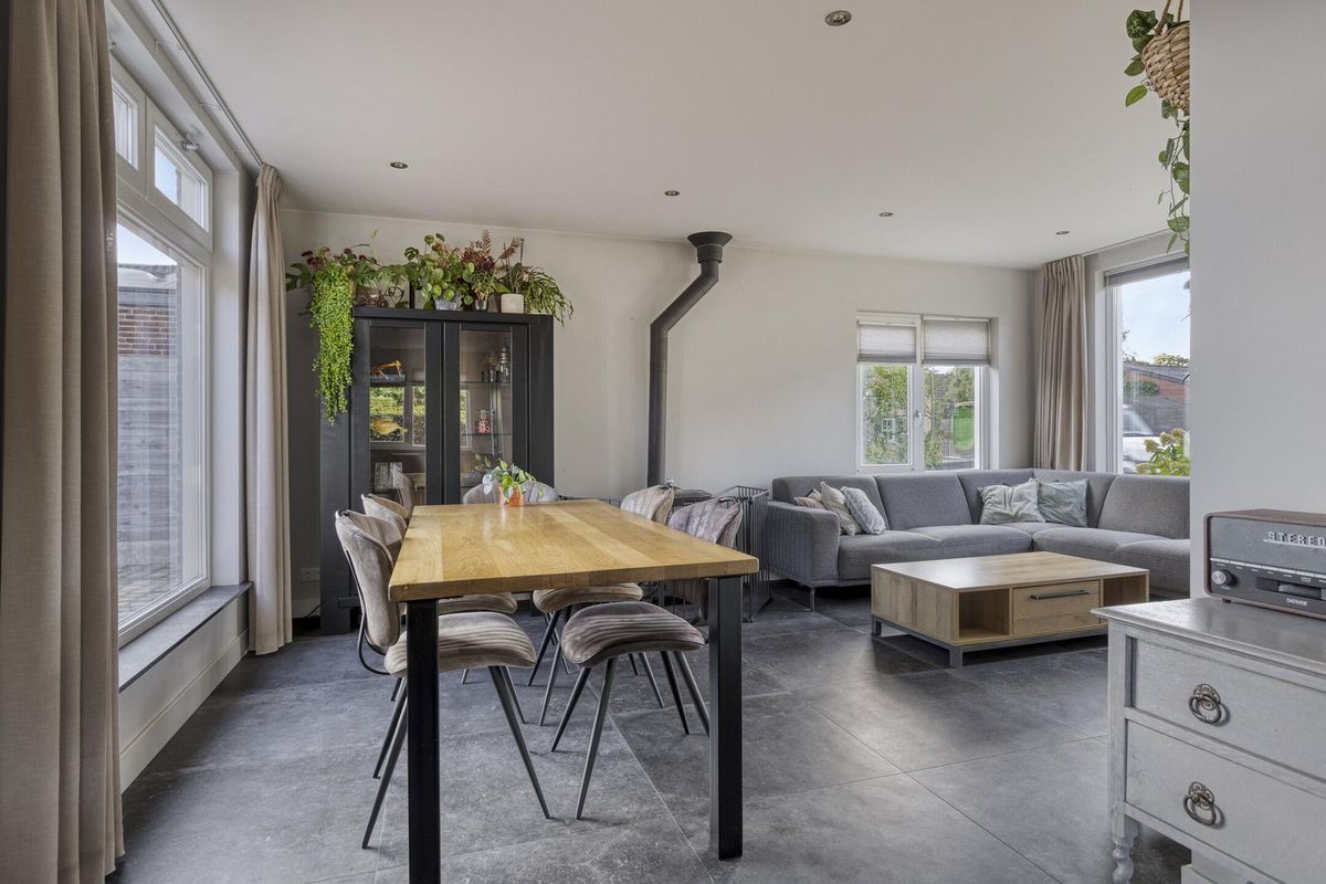 Vanuit de hal betreed je tevens de sfeervolle woonkamer, waar grote raampartijen zorgen voor een aangename lichtinval en de houtkachel garant staat voor extra warmte en gezelligheid tijdens de koudere maanden.