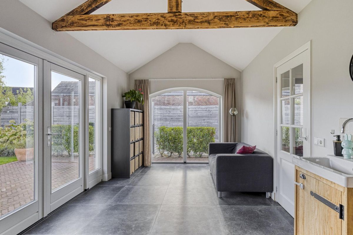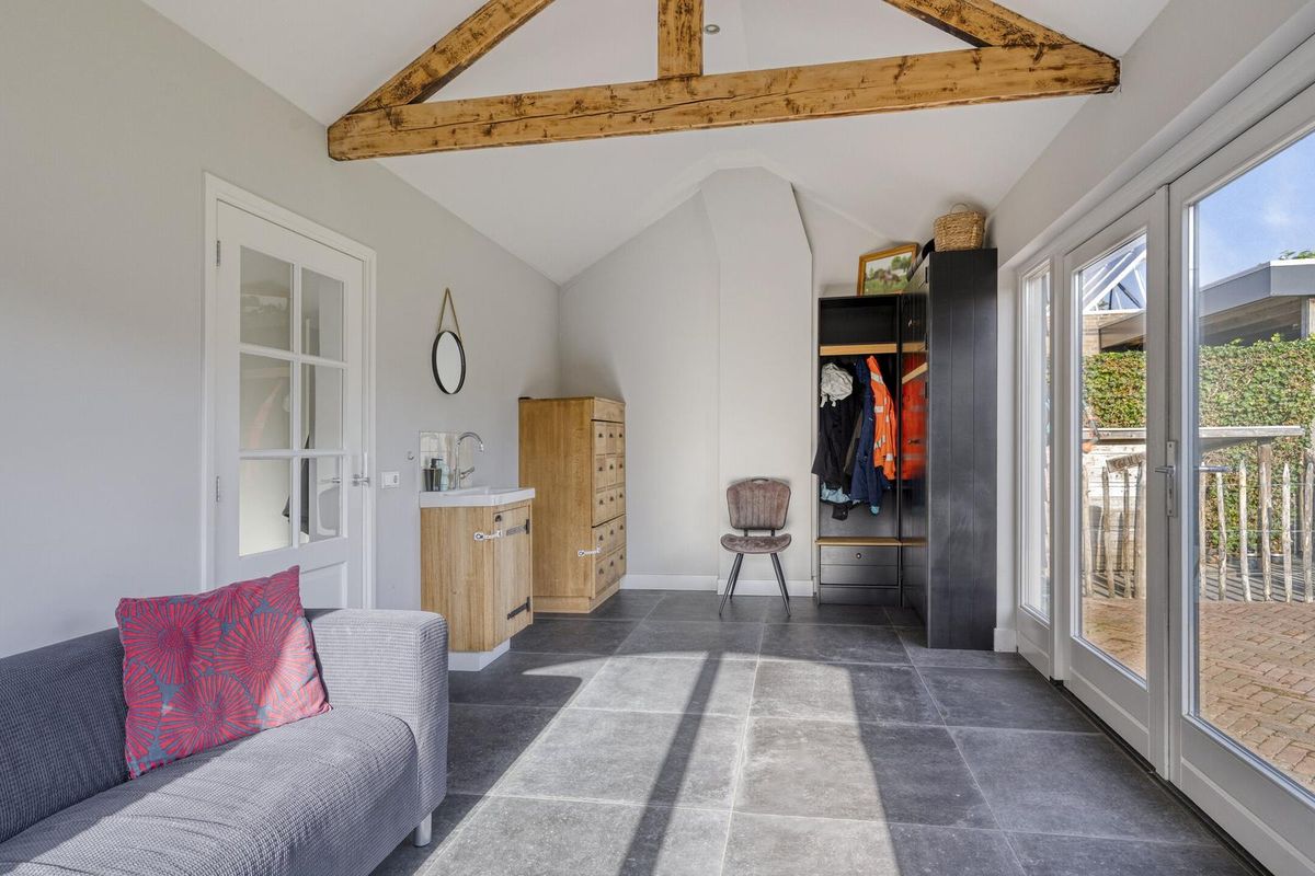 Naast de schuur bevindt zich een van de absolute parels van dit huis: ‘Het Café’. Een sfeervolle tuinkamer met stalen openslaande deuren naar het terras, een natuurstenen barblad, kastruimte en een stijlvolle waskom met koud water. Een perfecte plek om vrienden en familie te ontvangen en te borrelen.
