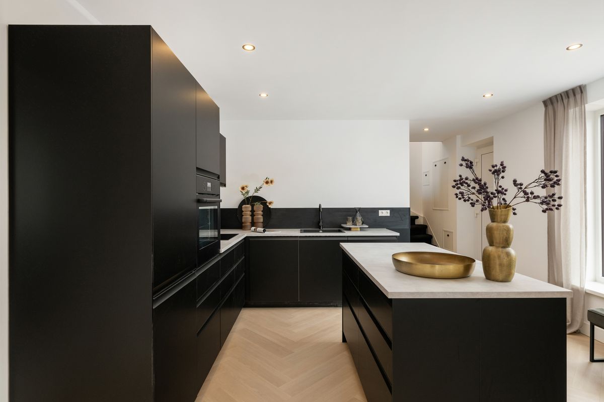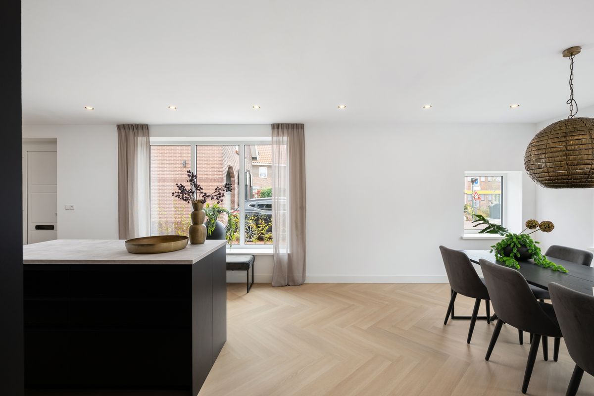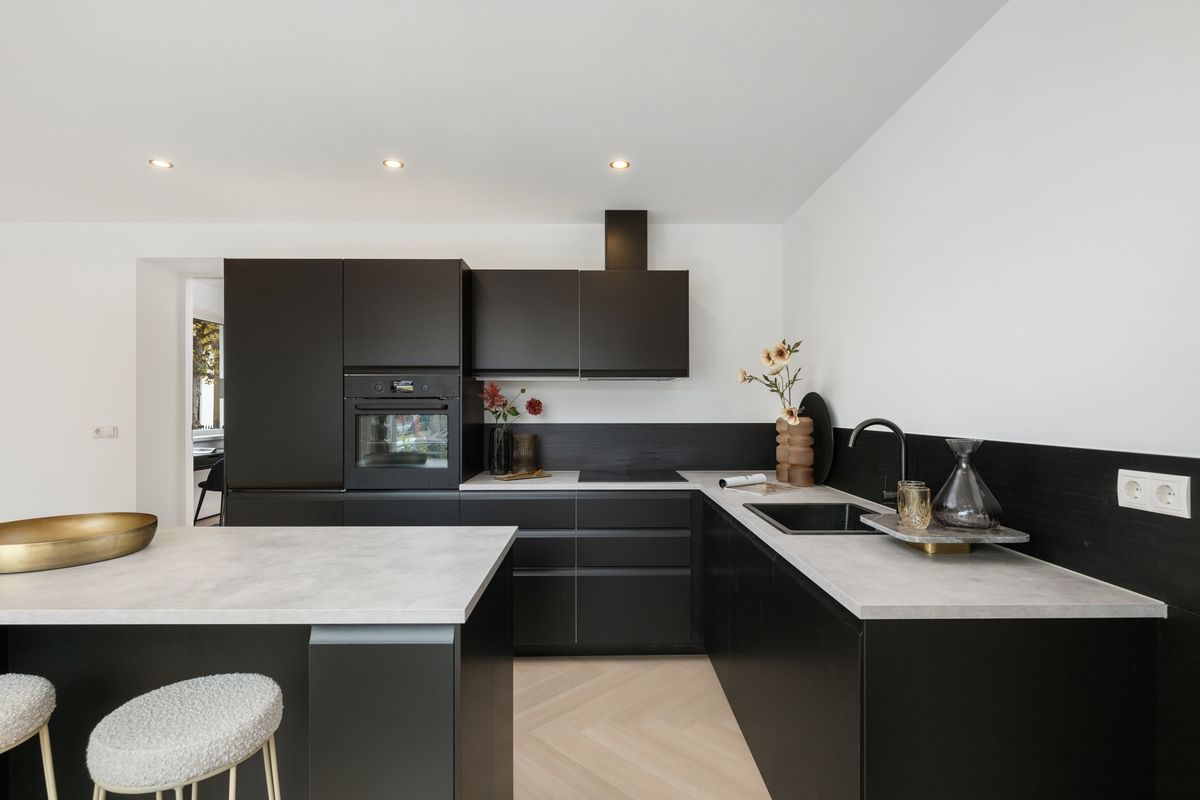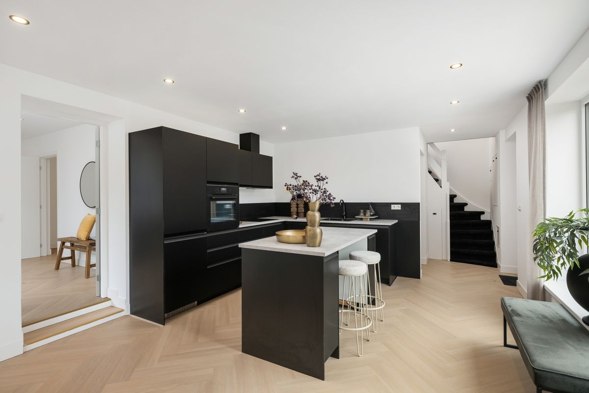 Bij binnenkomst komt u direct in de sfeervolle woonkeuken: het hart van het huis. Hier is gekozen voor een moderne zwarte keuken met alle gewenste inbouwapparatuur, waaronder een oven, koel-vriescombinatie, vaatwasser, inductie kookplaat en afzuigkap. De ruimte voelt licht en uitnodigend aan door de vele raampartijen, perfect om samen te koken en te tafelen.