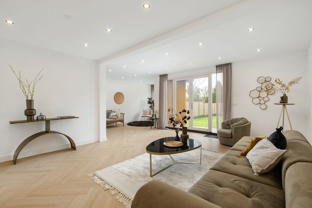 Vanuit deze ruimte loopt u door naar de royale uitgebouwde woonkamer met vrij zicht op de tuin aan het water. De grote ramen en openslaande deuren naar de tuin zorgen voor een zee aan licht. In deze ruimte bevindt zich de inpandige garage, die eenvoudig kan worden omgebouwd tot kantoor, extra kamer of hobbyruimte.