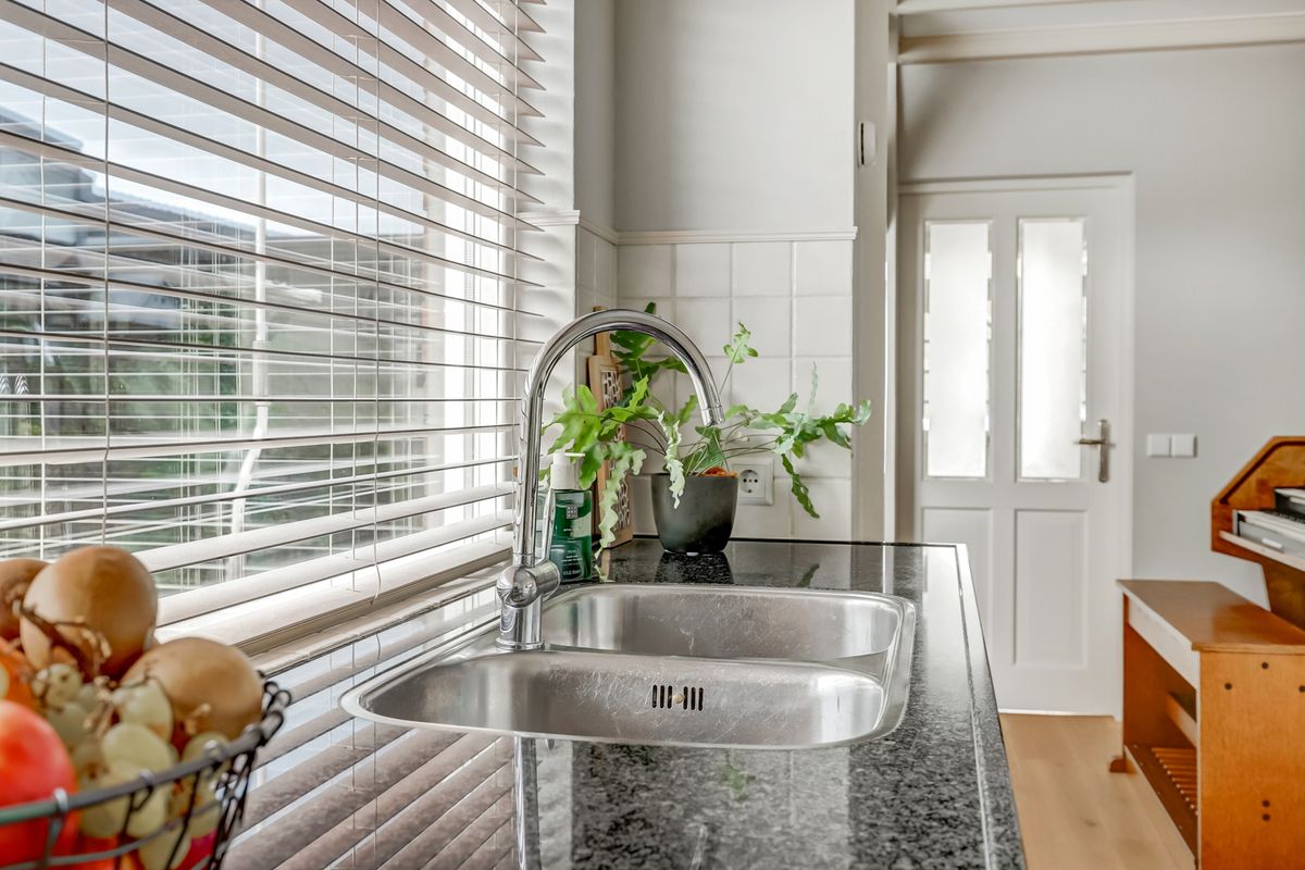De zonnige achtertuin op het westen is verzorgd en is voorzien van grote bering van ca. 10m². De tuin heeft een achterom.
