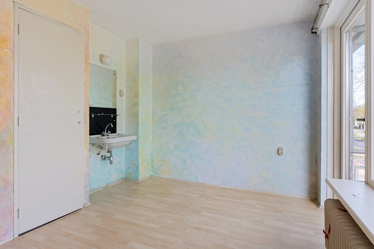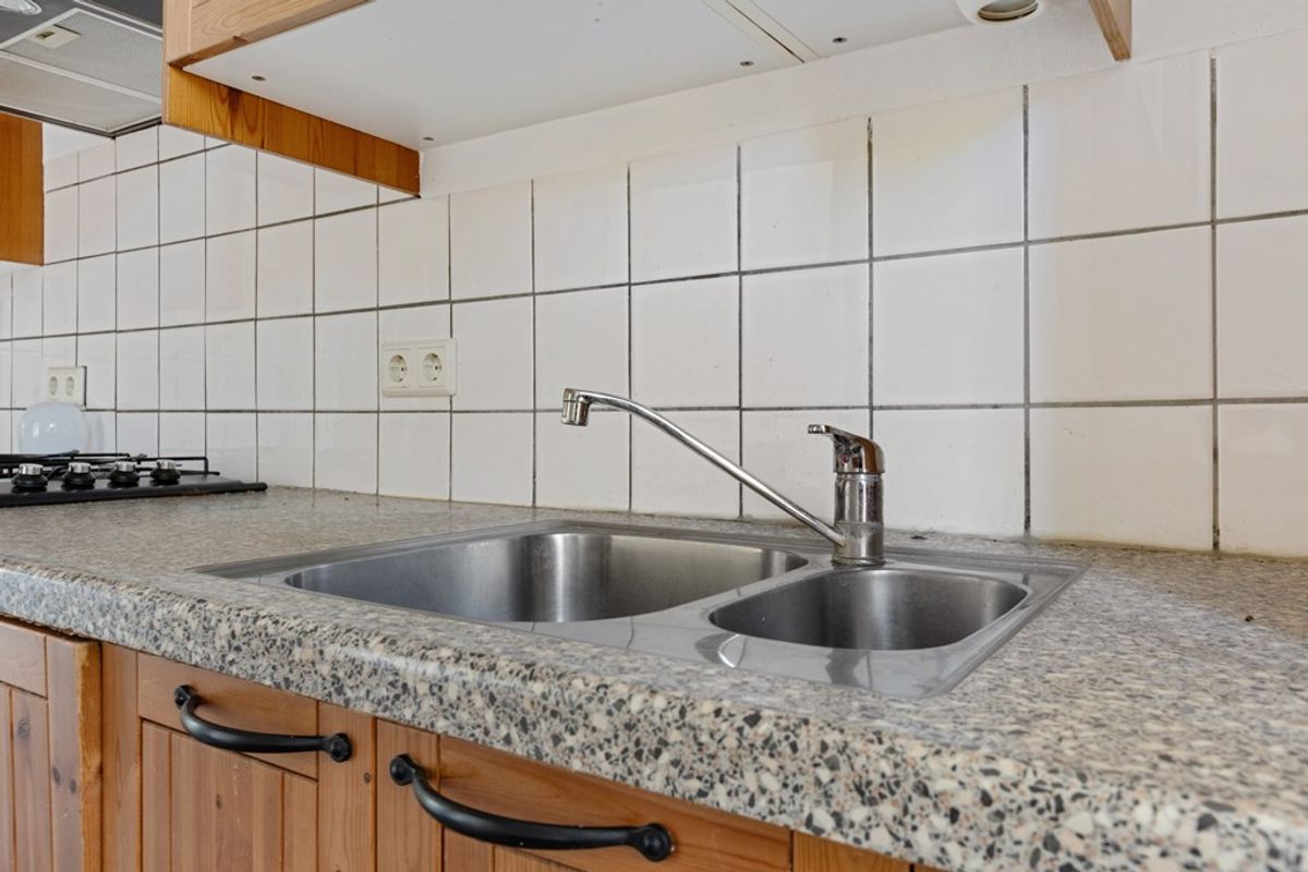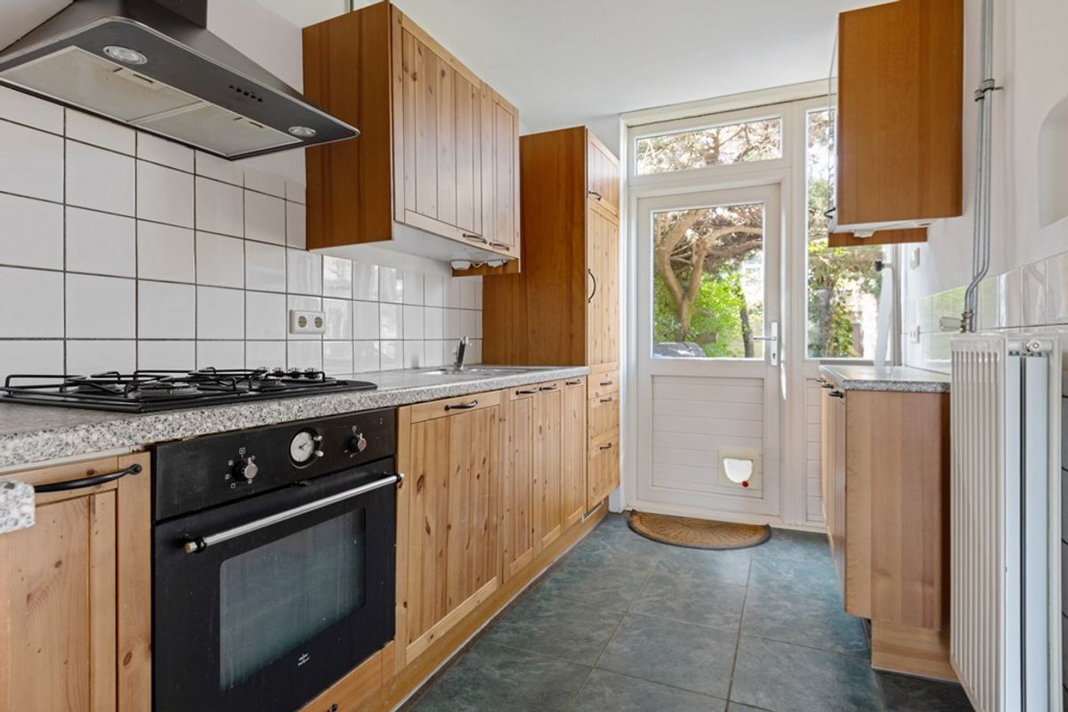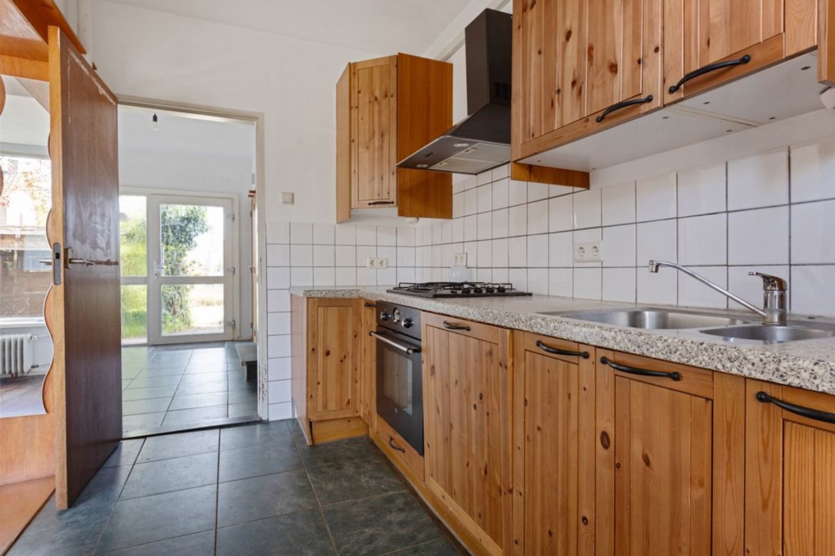 Aan de achterzijde van de woning is de keuken gelegen. De keuken is functioneel ingericht en beschikt over keukenkastjes en een werkblad. U beschikt hier over de benodigde ruimte om deze naar eigen wens te moderniseren. Vanuit de keuken is er toegang tot de buitenruimte.