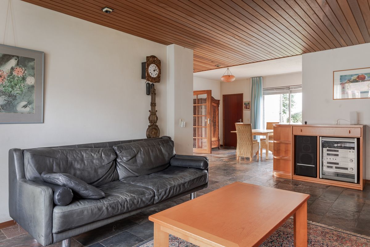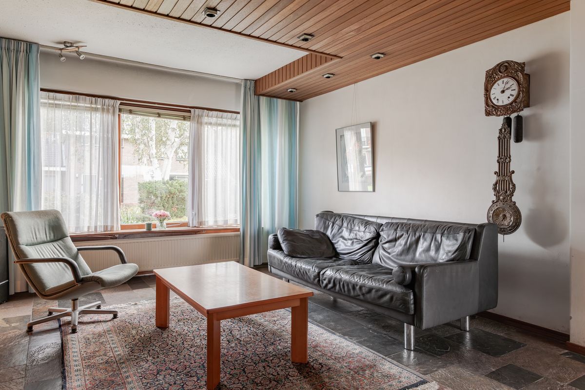 De straatgerichte living heeft een deels verlaagd houten plafond met inbouwspots, een gemetselde schouw met open haard en betonnen plateau, een brede raampartij met dubbel glas in een houten kozijn en een uitzetraam zodat er goed geventileerd kan worden. De wanden zijn gestuukt en bij de eethoek naast de keuken geeft een schuifpui toegang tot de zonnig gelegen tuin.
