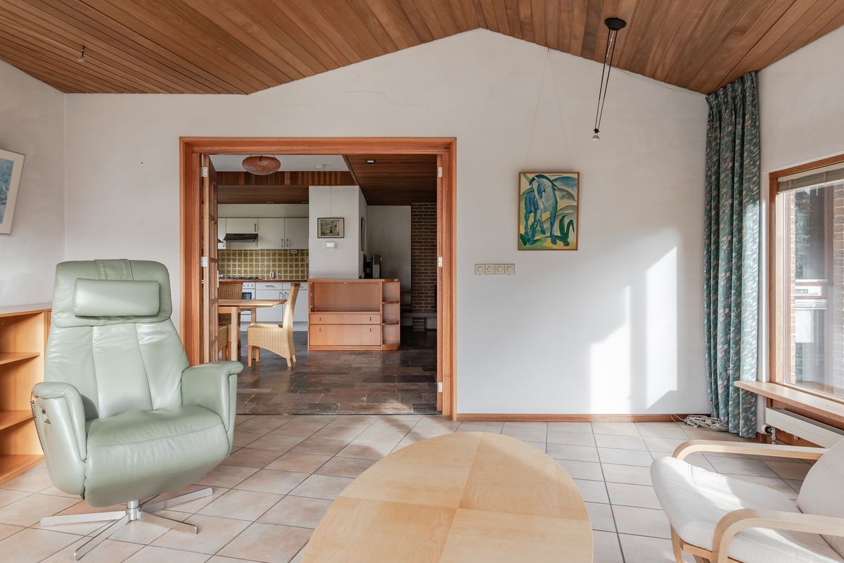 Vanuit de living geven openslaande deuren toegang tot de ruime tuinkamer die in 1993 is aangebouwd. Dit is eigenlijk wel de mooiste plek in deze woning vanwege het vele lichtinval en de laag geplaatste ramen die zicht geven op de diepe voortuin en het park aan de overkant van de straat. Op de vloer zijn lichte tegels met vloerverwarming als bijverwarming gelegd en onder de raampartijen zijn ook nog convectorradiatoren geplaatst. Het plafond is in hout uitgevoerd met inbouwspots, dakramen geven extra lichtinval en er is een brede schuifpui naar het zijterras waar u de hele dag van de zon kan genieten.