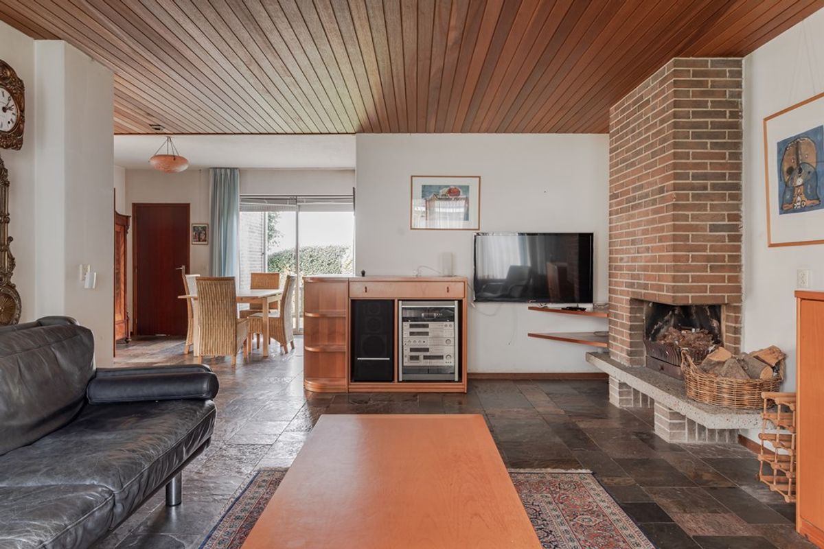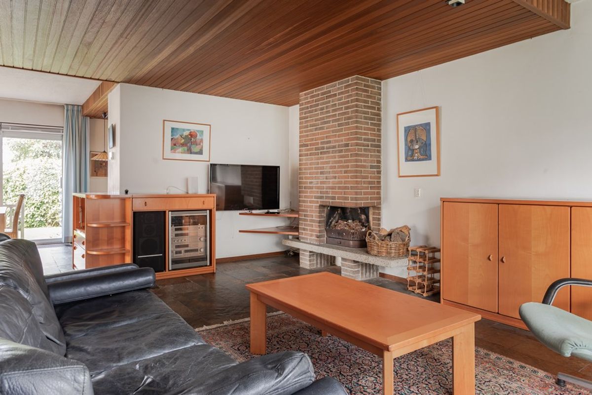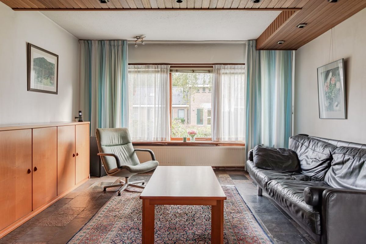 De straatgerichte living heeft een deels verlaagd houten plafond met inbouwspots, een gemetselde schouw met open haard en betonnen plateau, een brede raampartij met dubbel glas in een houten kozijn en een uitzetraam zodat er goed geventileerd kan worden. De wanden zijn gestuukt en bij de eethoek naast de keuken geeft een schuifpui toegang tot de zonnig gelegen tuin.
