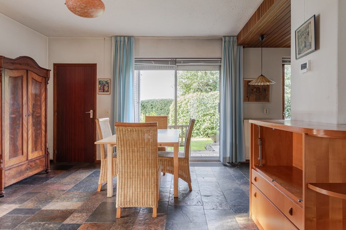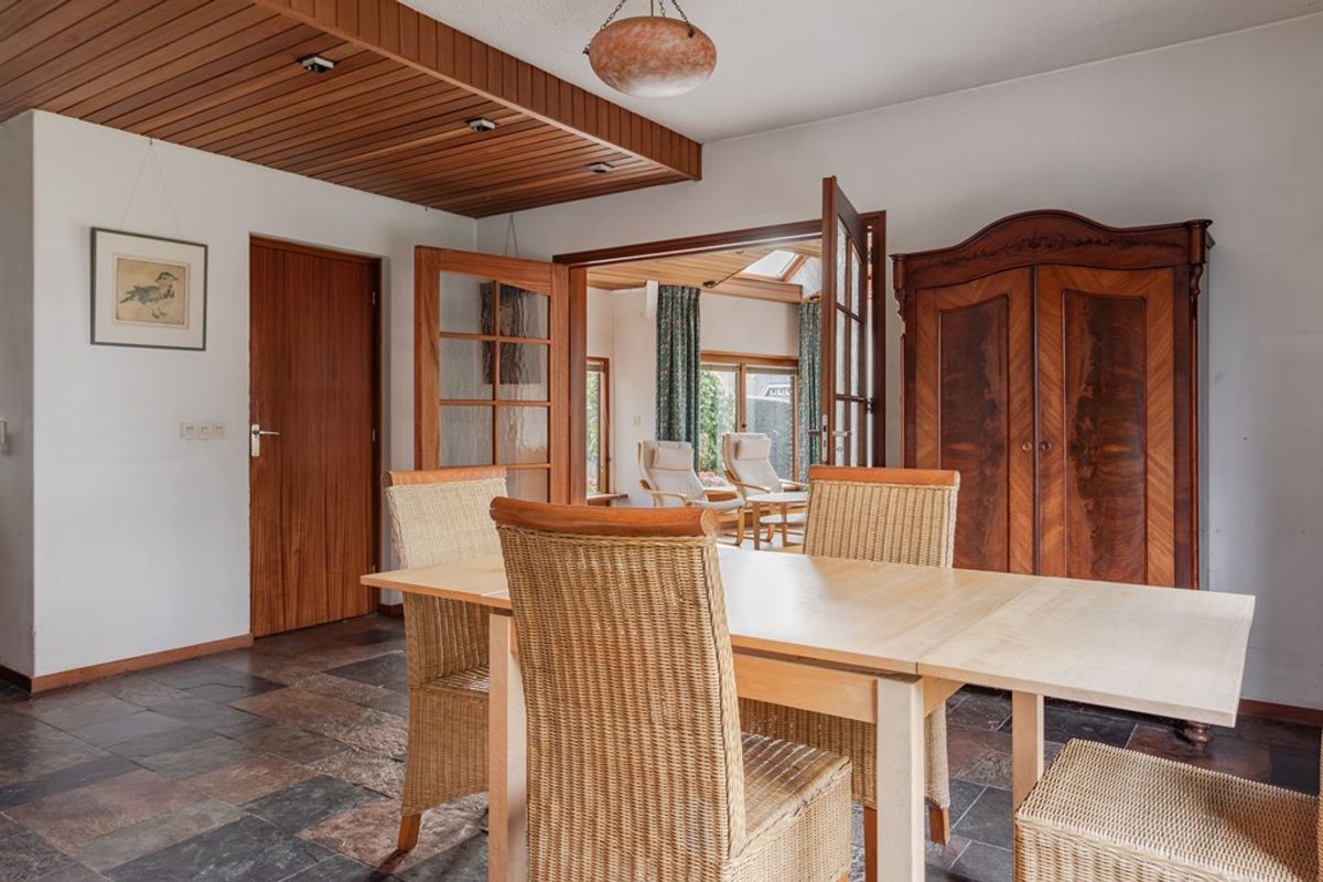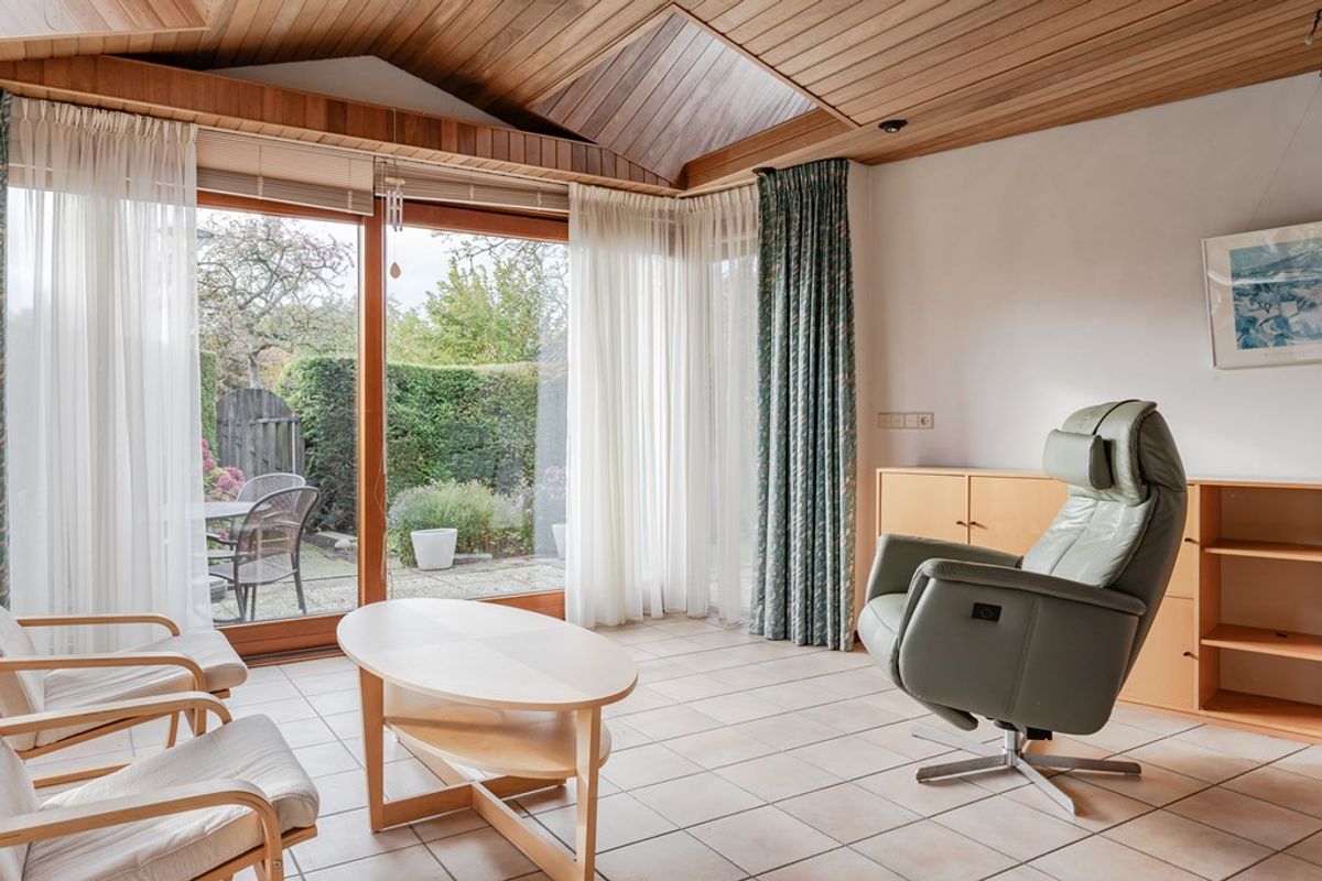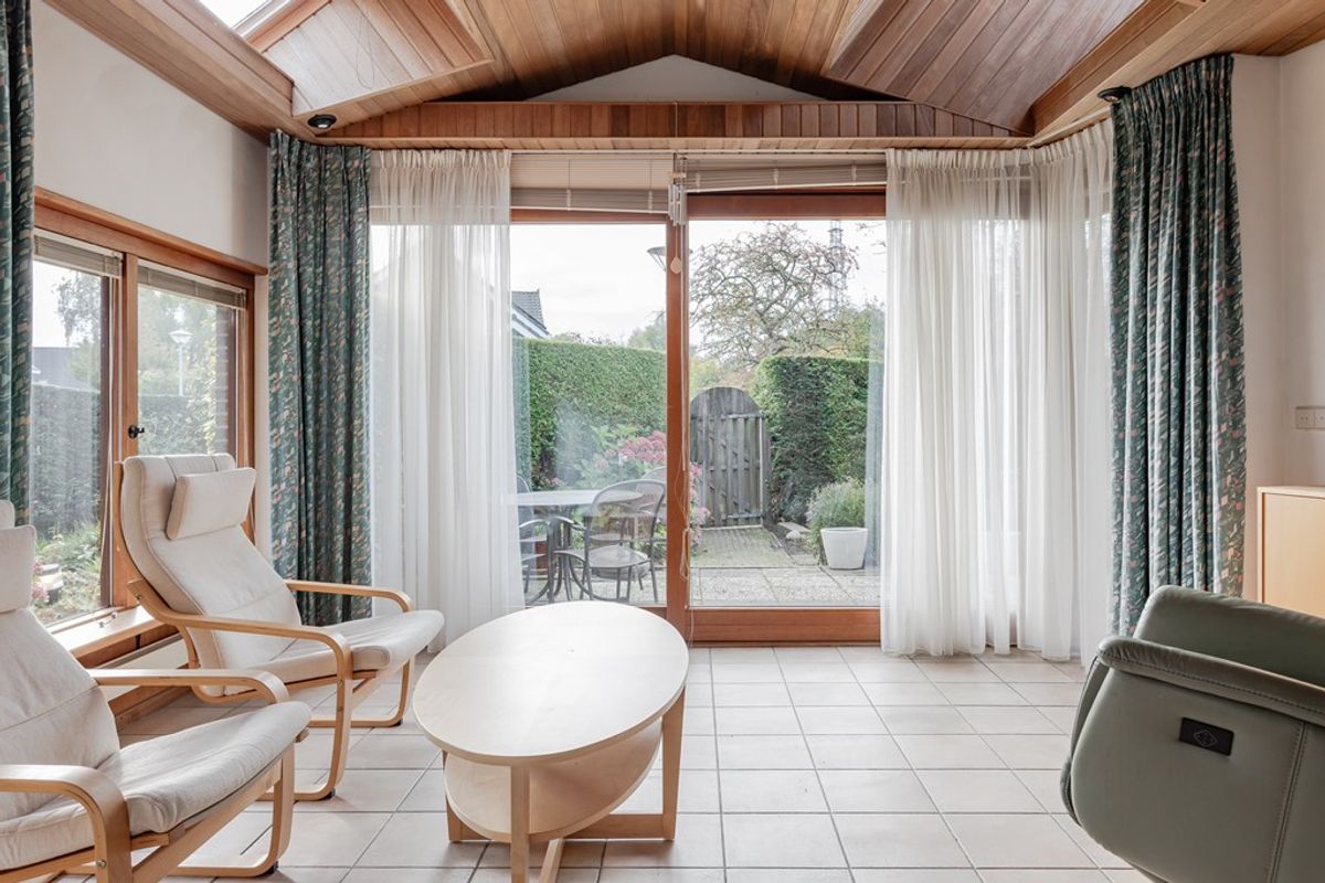 Vanuit de living geven openslaande deuren toegang tot de ruime tuinkamer die in 1993 is aangebouwd. Dit is eigenlijk wel de mooiste plek in deze woning vanwege het vele lichtinval en de laag geplaatste ramen die zicht geven op de diepe voortuin en het park aan de overkant van de straat. Op de vloer zijn lichte tegels met vloerverwarming als bijverwarming gelegd en onder de raampartijen zijn ook nog convectorradiatoren geplaatst. Het plafond is in hout uitgevoerd met inbouwspots, dakramen geven extra lichtinval en er is een brede schuifpui naar het zijterras waar u de hele dag van de zon kan genieten.