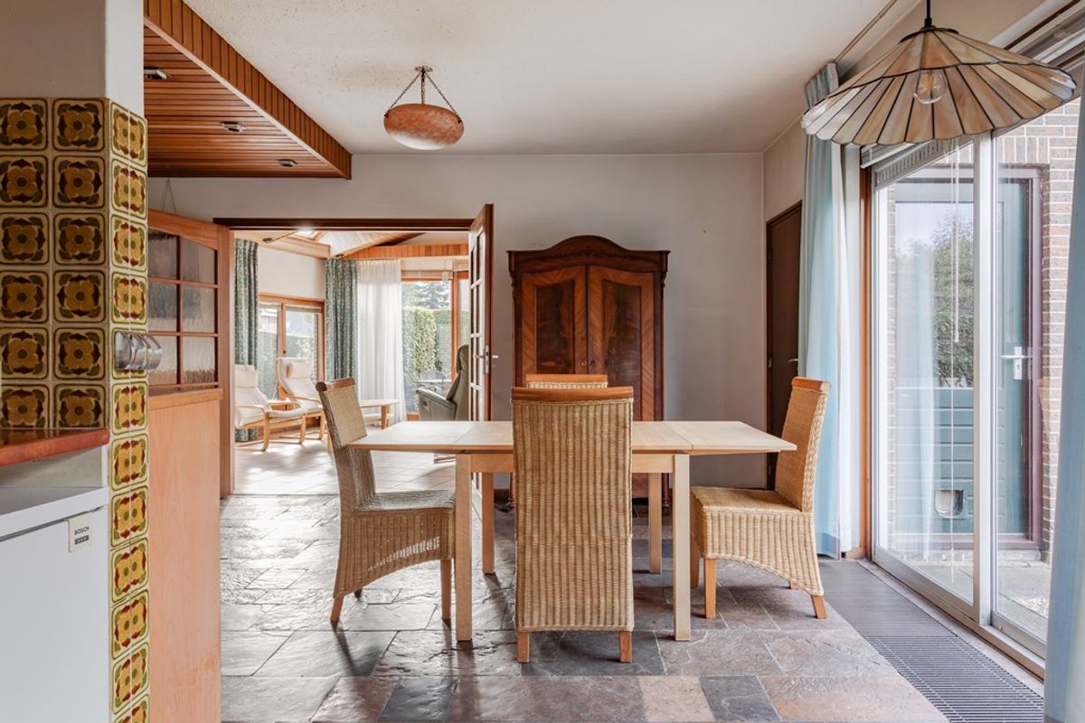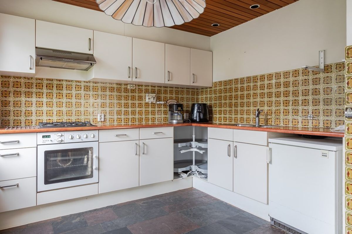 Halfopen keuken met een schuifpui voorzien van dubbel glas bij de eethoek en een convectorput. Een groot tuingericht raam kan open en ook hier is het plafond verlaagd met inbouwspots voor de verlichting. De keuken is in een hoek geplaatst en is gedateerd. Er is wel veel werkblad, retro wandtegels, veel kastruimte, een carrouselkast zonder deurtjes, bovenkastjes, een dubbele spoelbak, 4 pits gaskomfoor, een oven en een afzuigkap. Als er toch een nieuwe keuken geplaatst gaat worden is het qua ruimte mogelijk om een kookeiland te installeren.