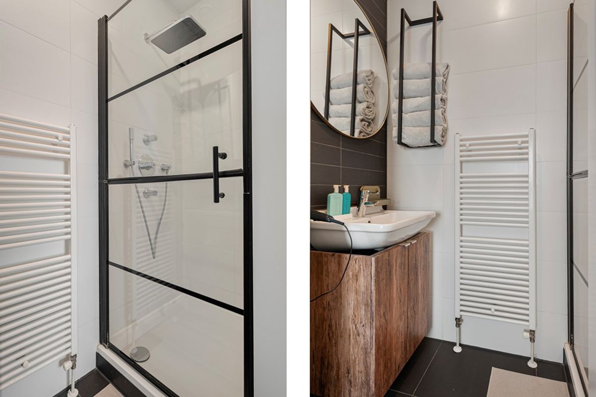 De badkamer is compact maar netjes afgewerkt en volledig betegeld. Deze is voorzien van een douche en een wastafel, waardoor het een functionele en verzorgde ruimte is.