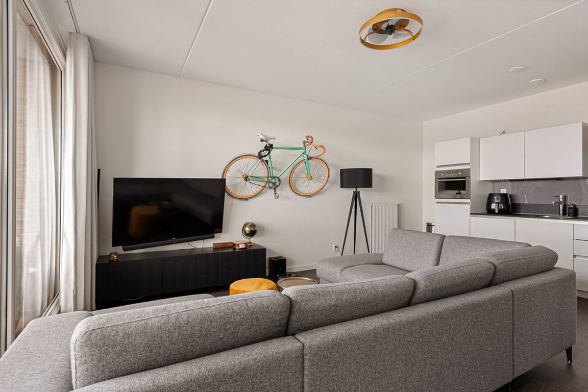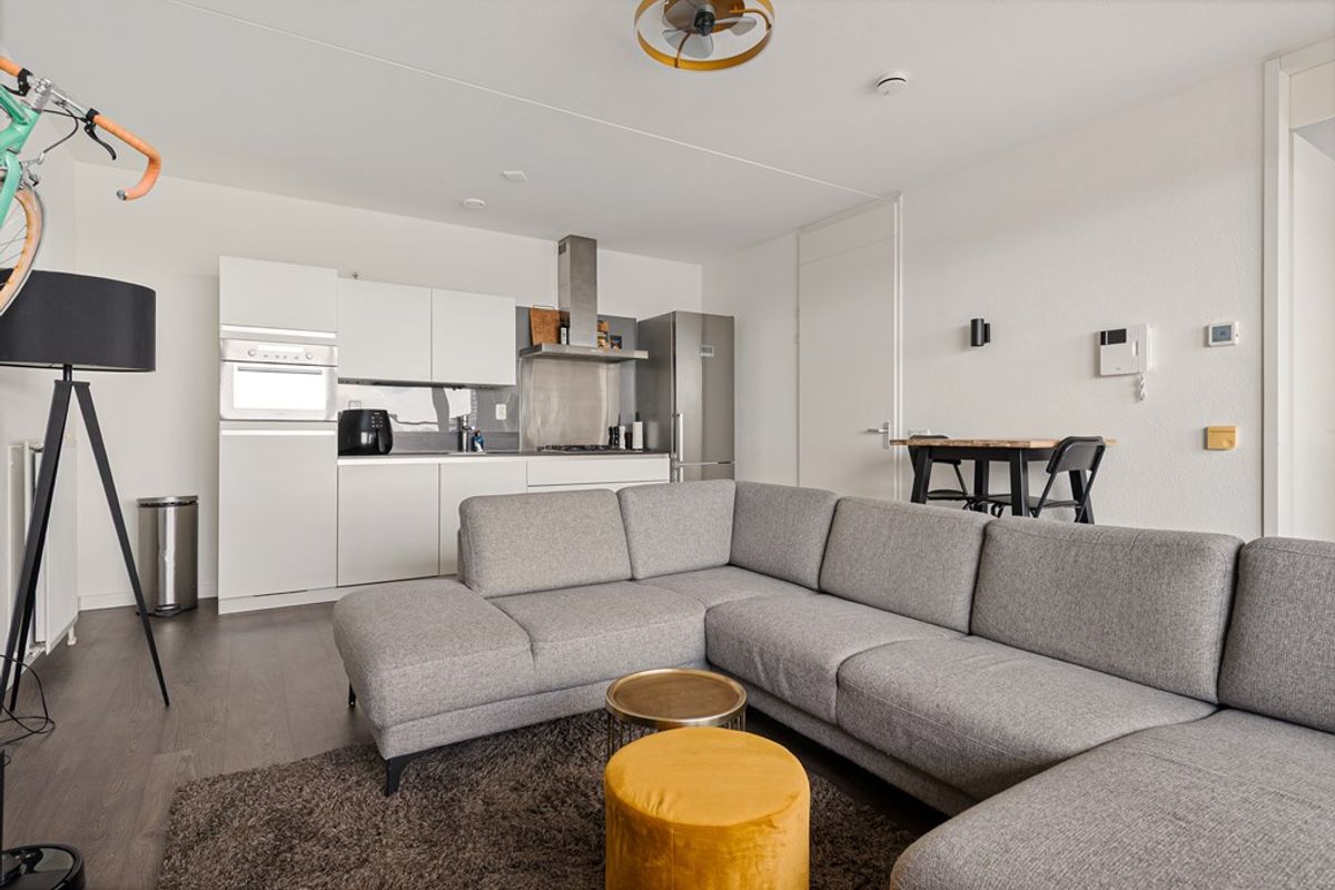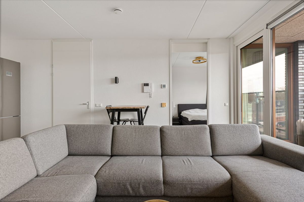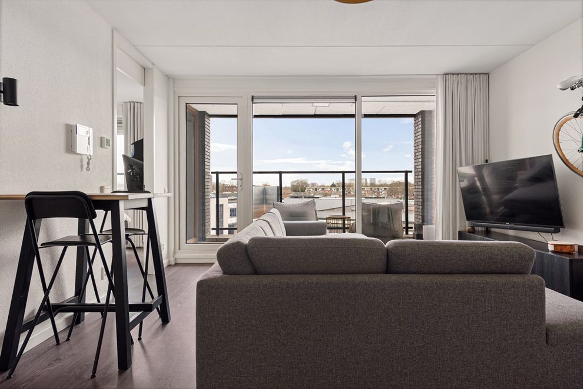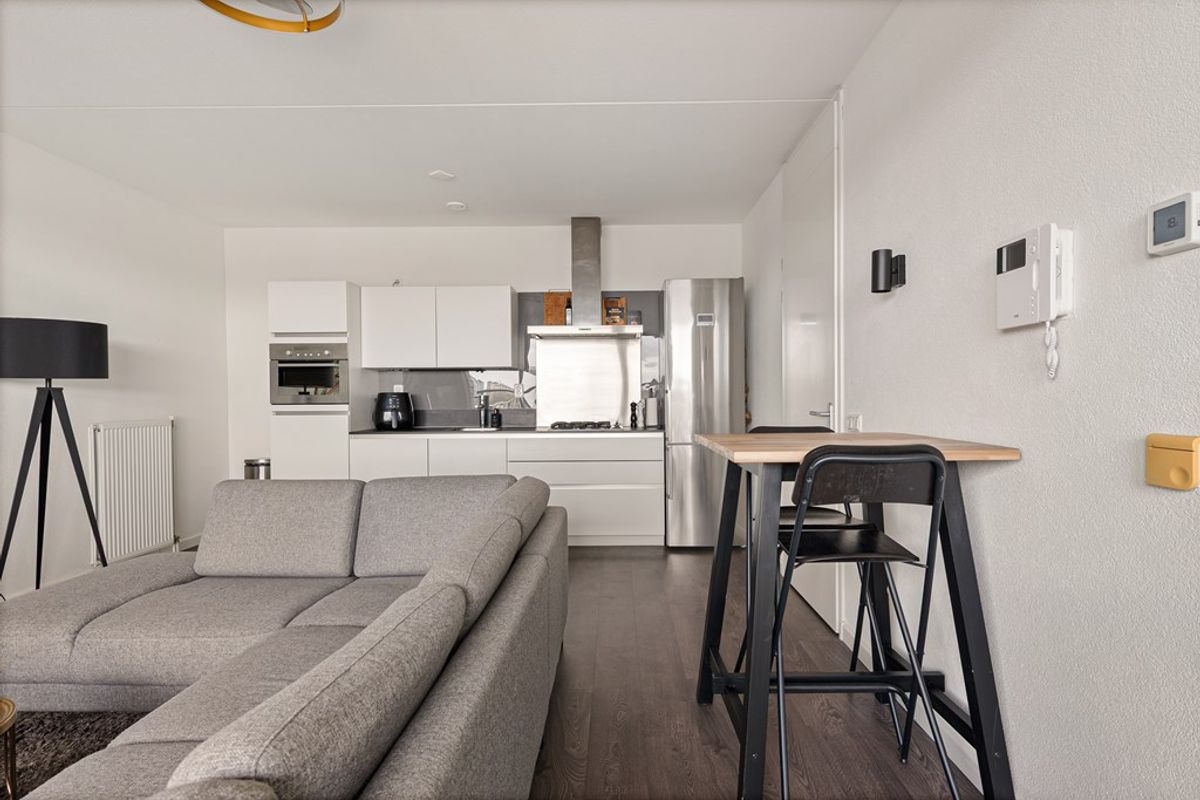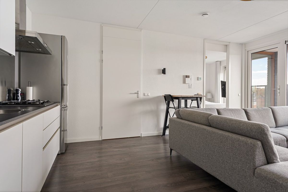 De woonkamer is licht en ruim dankzij de grote raampartijen, die zorgen voor een prettige en natuurlijke lichtinval. De ruimte is efficiënt ingedeeld en biedt voldoende mogelijkheden voor het creëren van zowel een comfortabele zithoek als een gezellige eethoek. Vanuit de woonkamer heeft u directe toegang tot het balkon, wat een mooie verlenging vormt van de leefruimte.