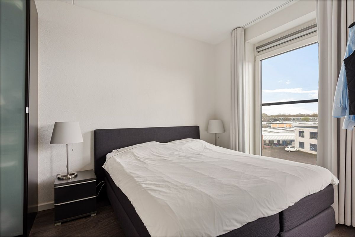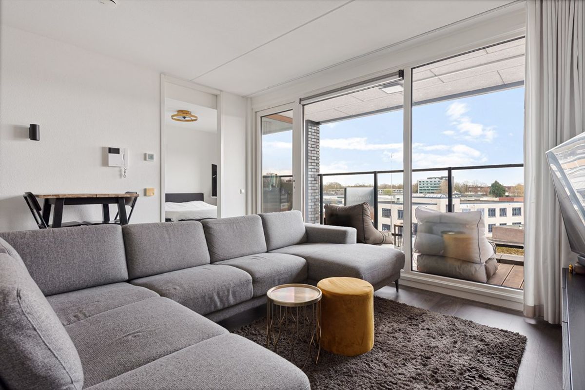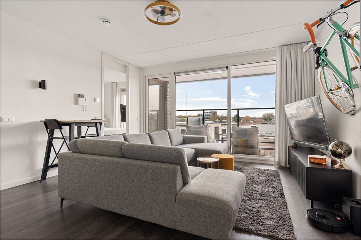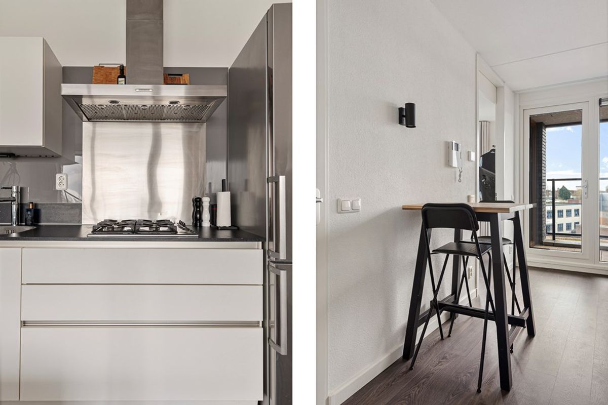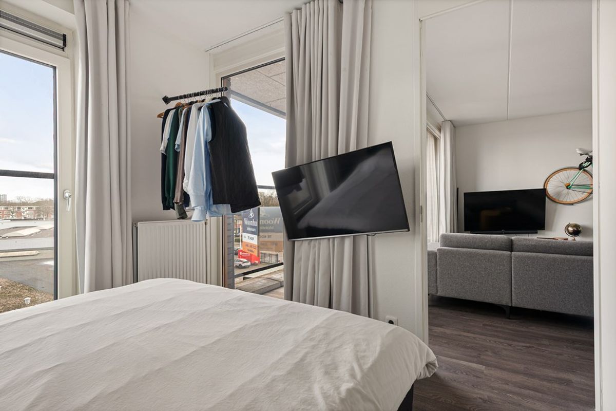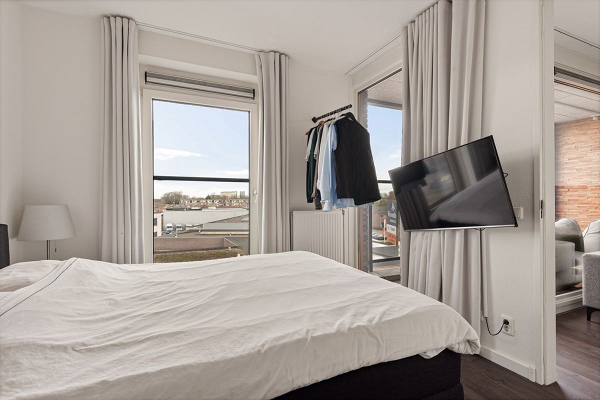 De woonkamer is licht en ruim dankzij de grote raampartijen, die zorgen voor een prettige en natuurlijke lichtinval. De ruimte is efficiënt ingedeeld en biedt voldoende mogelijkheden voor het creëren van zowel een comfortabele zithoek als een gezellige eethoek. Vanuit de woonkamer heeft u directe toegang tot het balkon, wat een mooie verlenging vormt van de leefruimte.