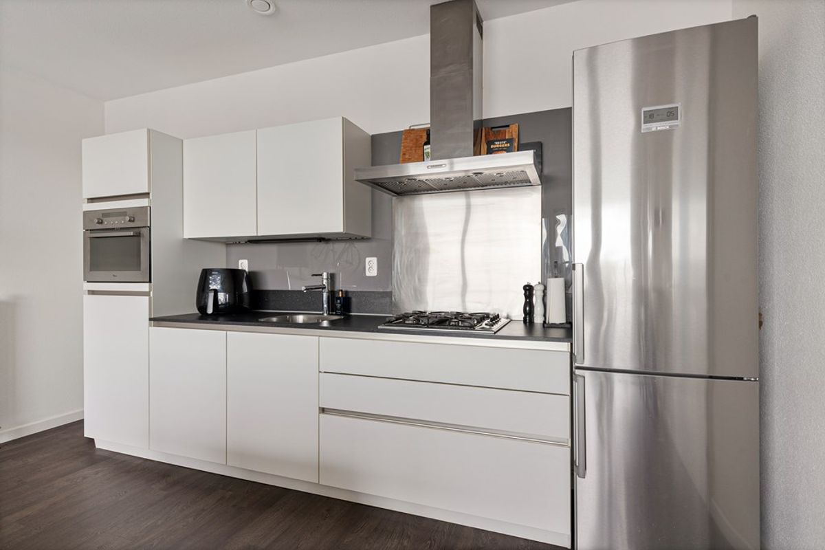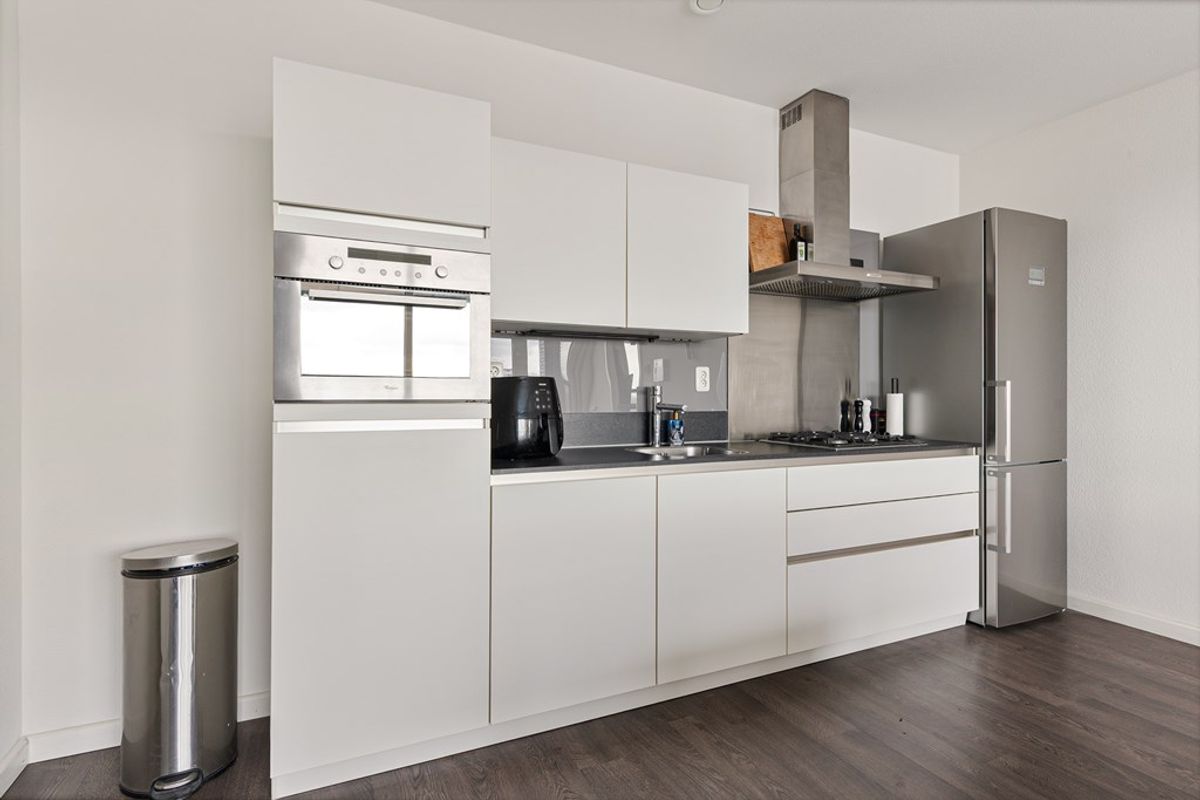 De open keuken sluit naadloos aan op de woonkamer en is praktisch ingericht. De keuken beschikt over diverse keukenkastjes en een werkblad, en is voorzien van de benodigde apparatuur, waaronder een kookplaat, afzuigkap en spoelbak. Hiermee is de keuken volledig geschikt voor dagelijks gebruik.