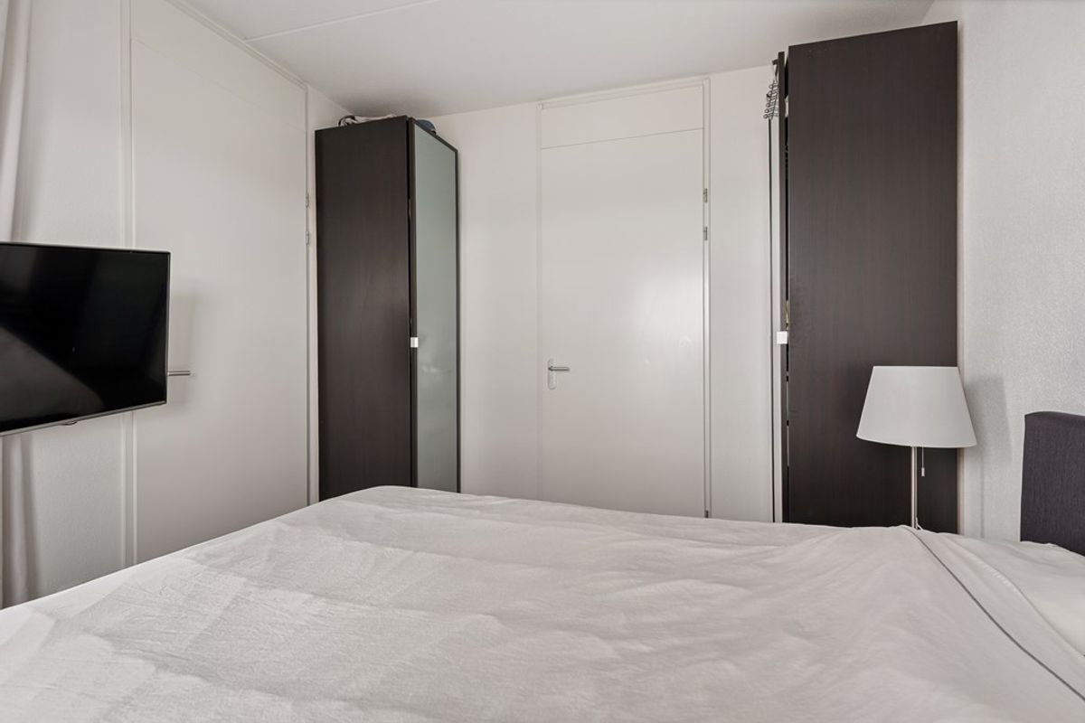 De slaapkamer is bereikbaar via de hal en is rustig gelegen, wat bijdraagt aan een goede nachtrust. De kamer biedt voldoende ruimte voor een tweepersoonsbed en een kledingkast.