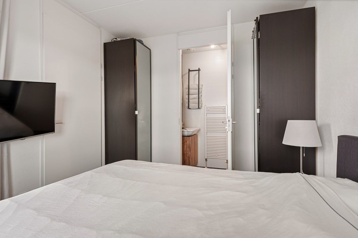 The bedroom is accessible from the hallway and is quietly located, contributing to a good night’s rest. The room offers enough space for a double bed and wardrobe.