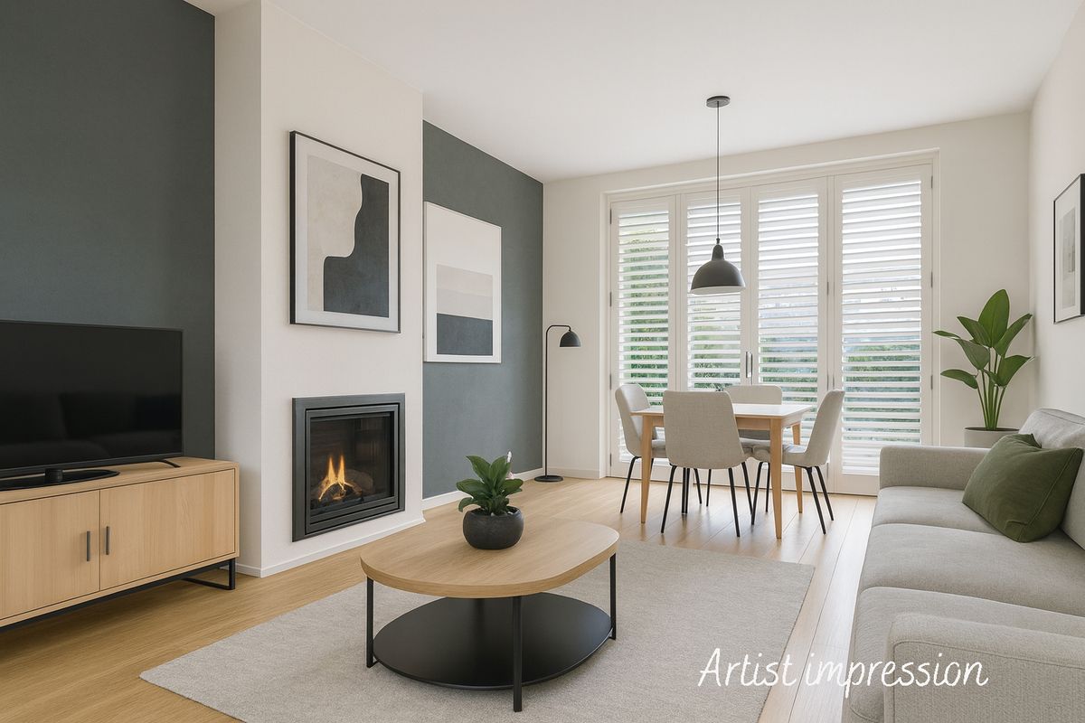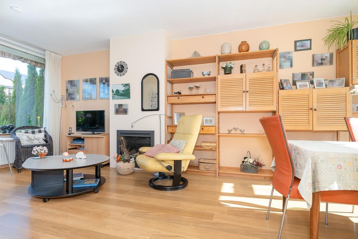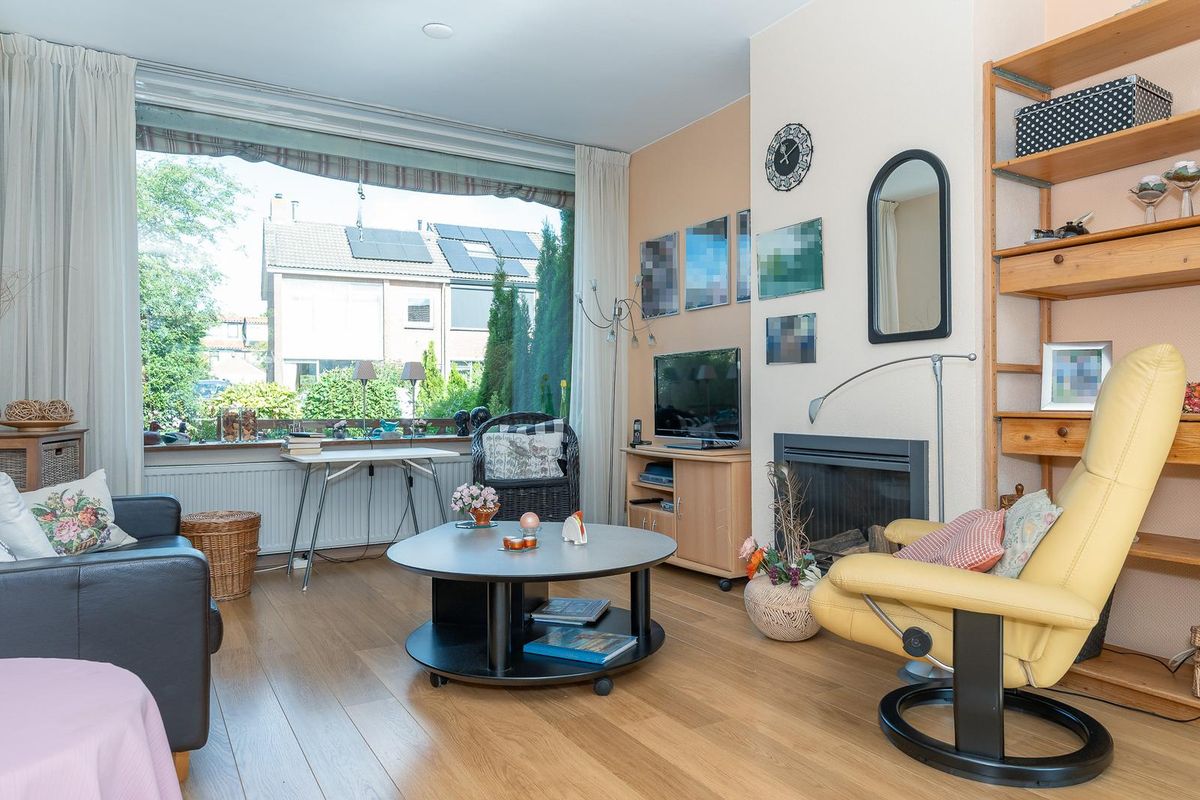 Door de hal met de trapopgang en toegang tot het toilet en de keuken, kom je in de woonkamer. Door de grote ramen aan weerszijde is dit een heerlijke, lichte ruimte met uitzicht op de voor- en achtertuin. De woonkamer is voorzien van een gashaard en een lichte laminaatvloer.