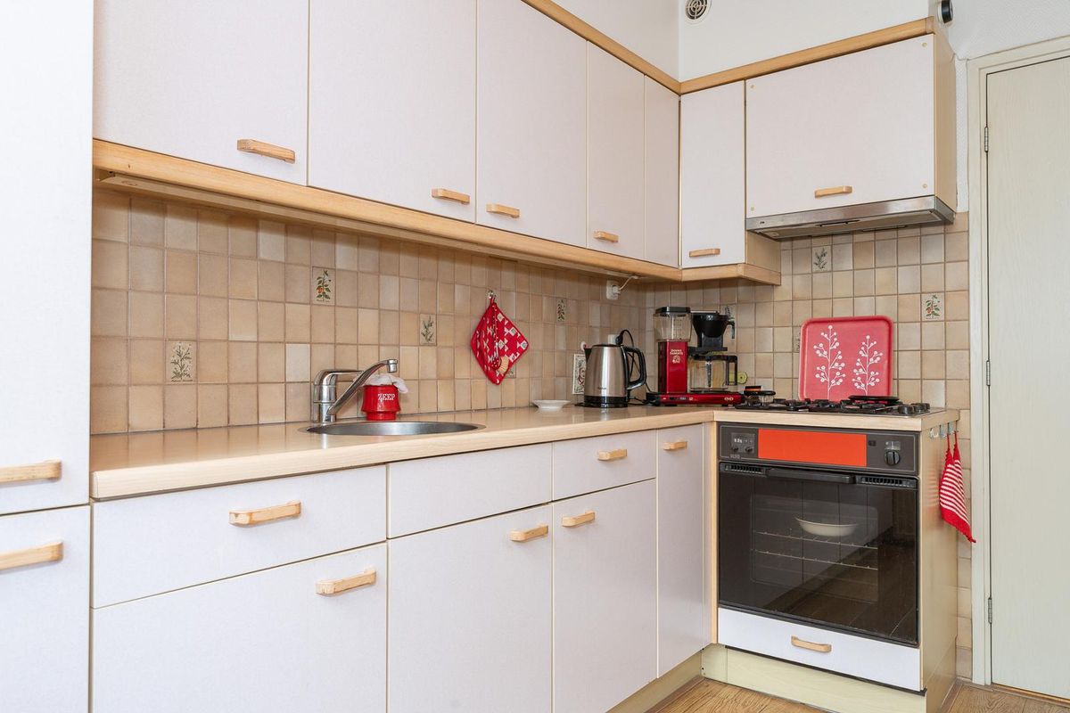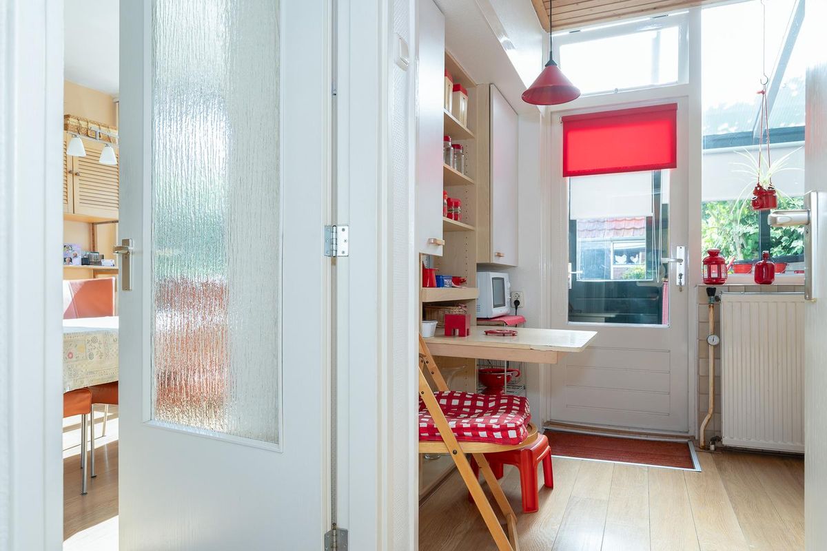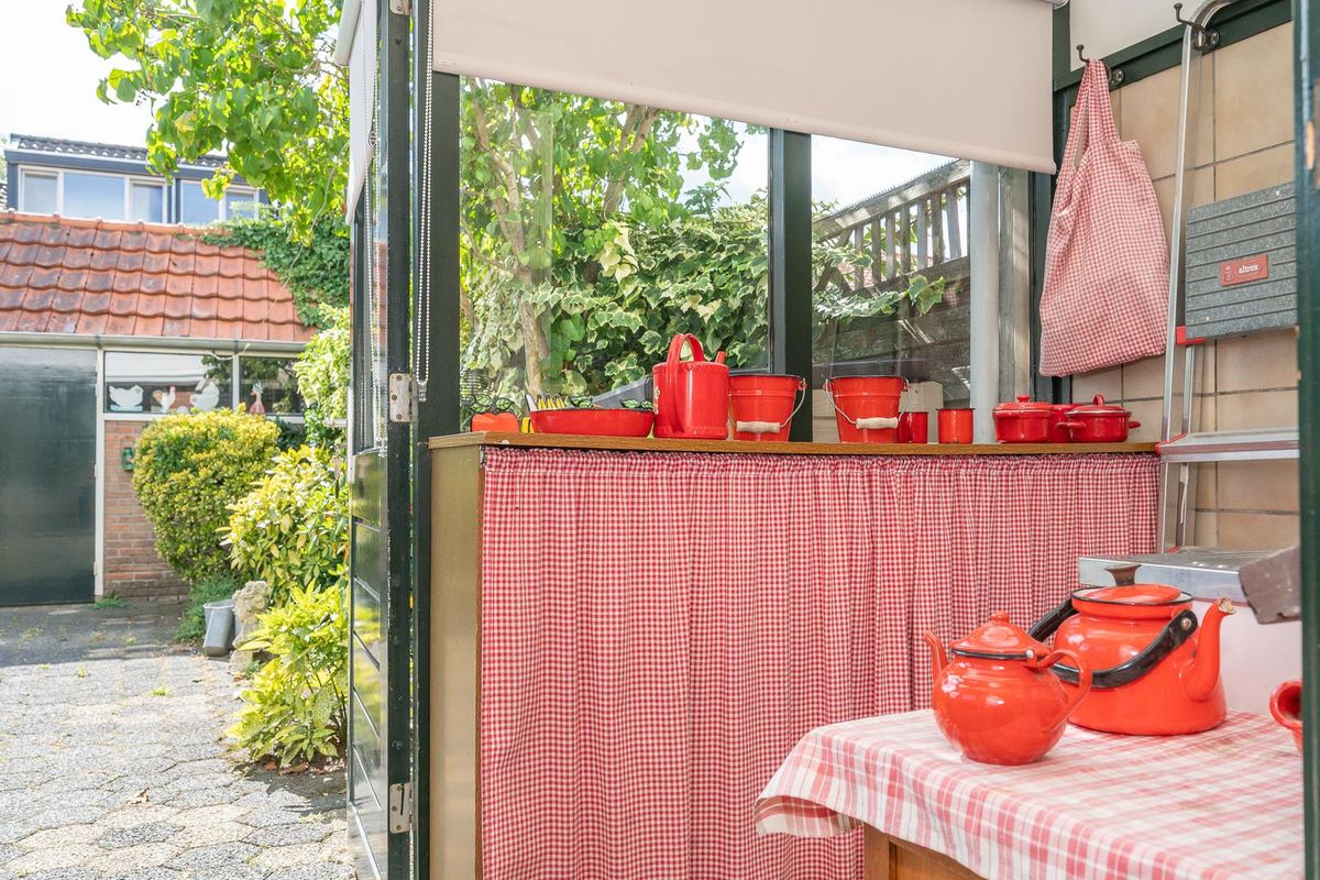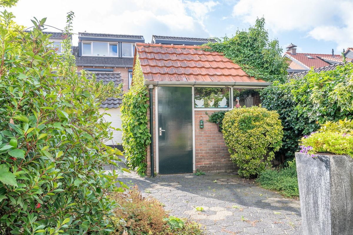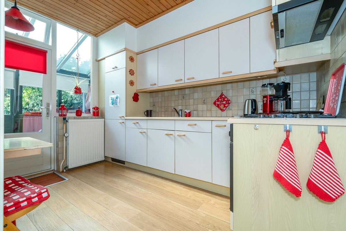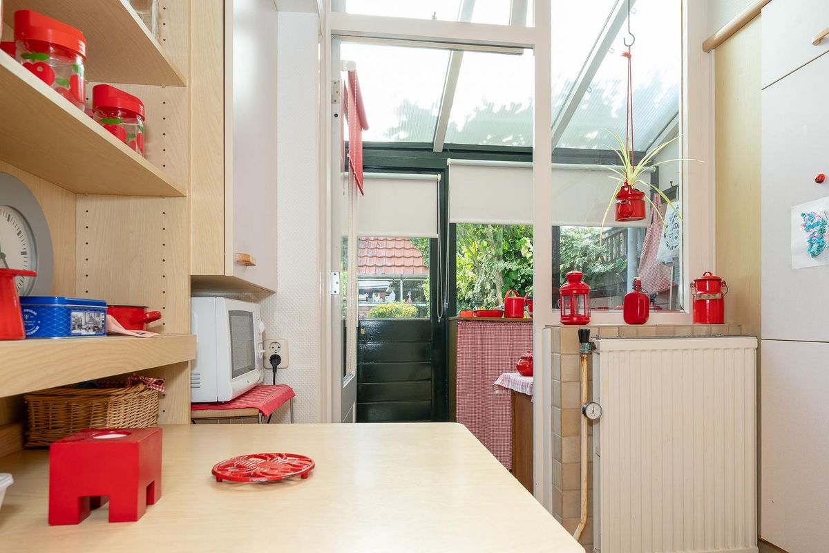 De gesloten keuken is gedateerd maar netjes en een fijne brede ruimte. Via de achterdeur kom je eerst in de bijkeuken Heel handig voor de modderige tuinschoenen. De diepe achtertuin is voorzien van een leuke schuur met pannen dakje en een achterom. In deze diepe tuin is er altijd wel een plekje te vinden om lekker van het zonnetje te genieten.