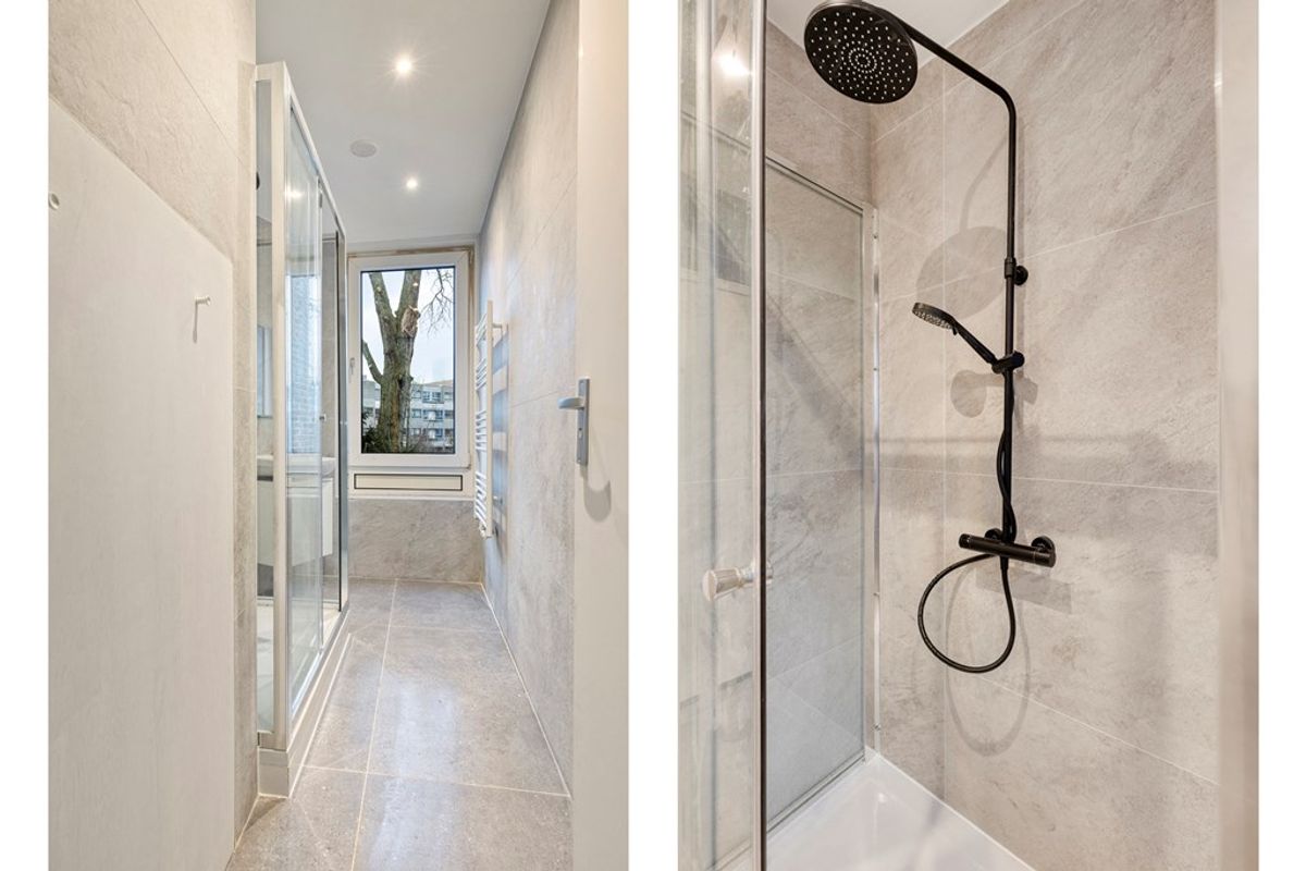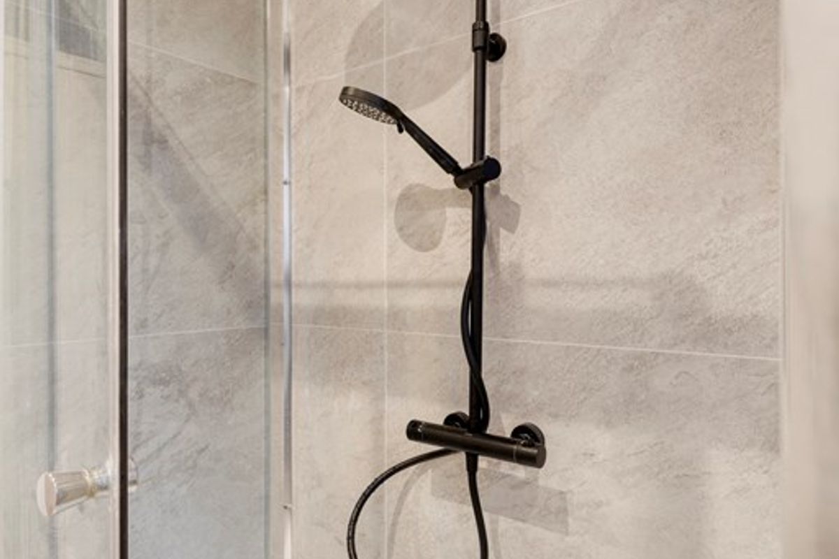 Centraal in de woning ligt de ruime badkamer, uitgevoerd met een inloopdouche en wastafelmeubel. Het separate toilet is vanuit de gang bereikbaar.