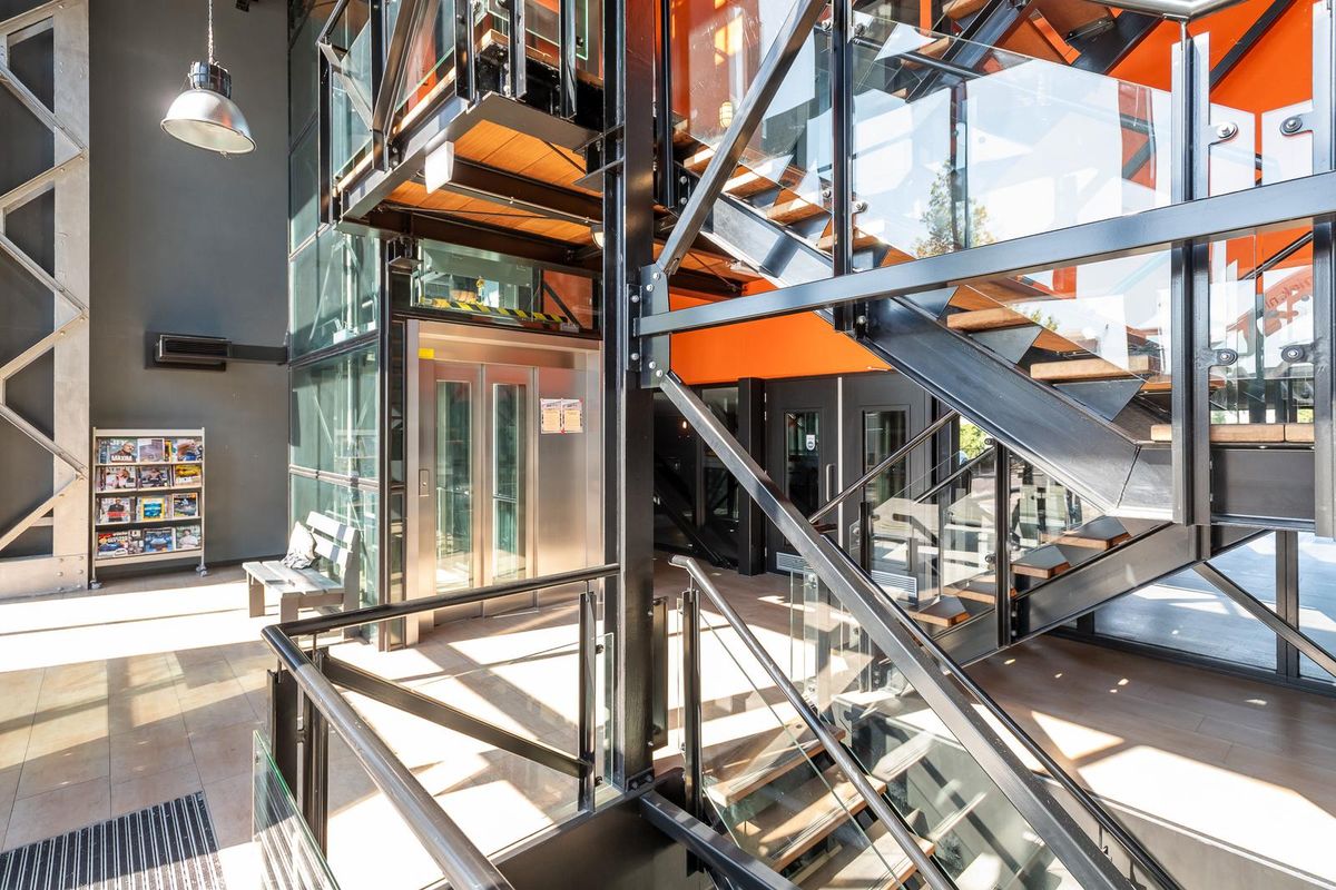 Afgesloten imposante entree/centrale hal met fraaie spanten, brievenbussen, toegang tot de parkeergarage, het trappenhuis, een ruime, ‘glazen’ lift en via een trap bereikt u de bergingen in de onderbouw.