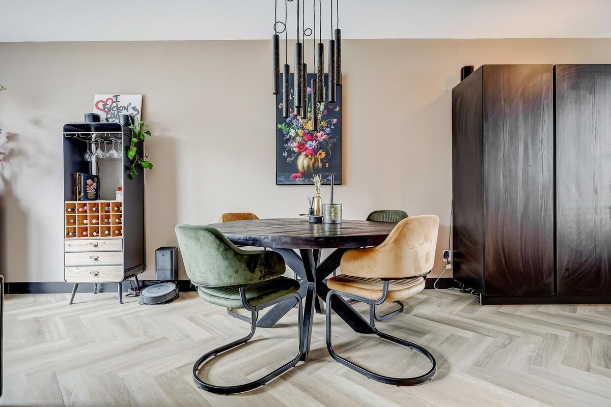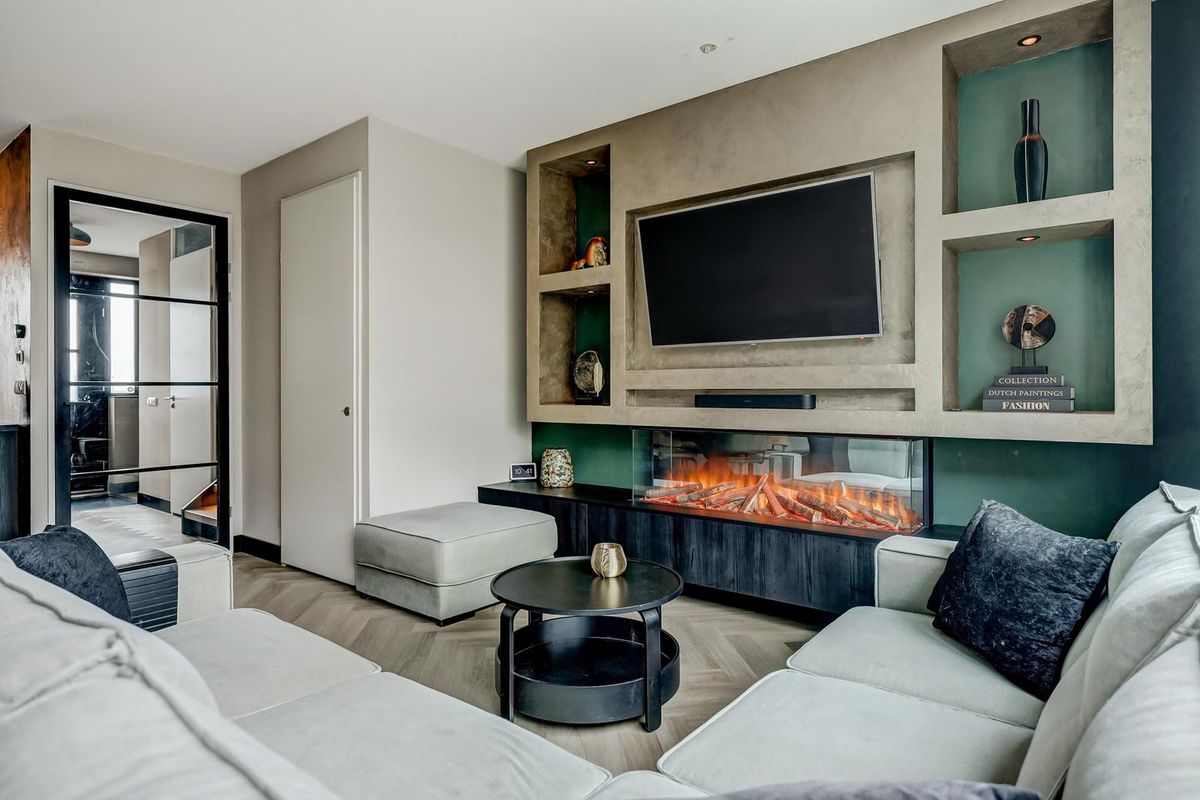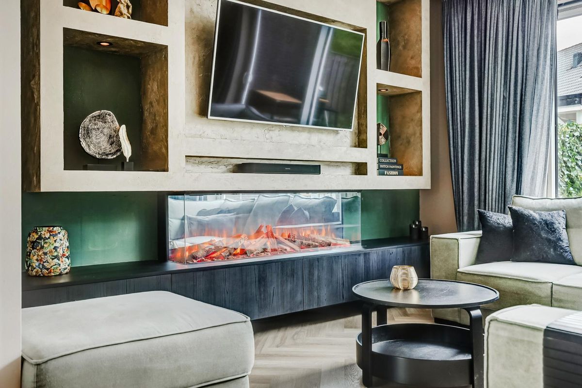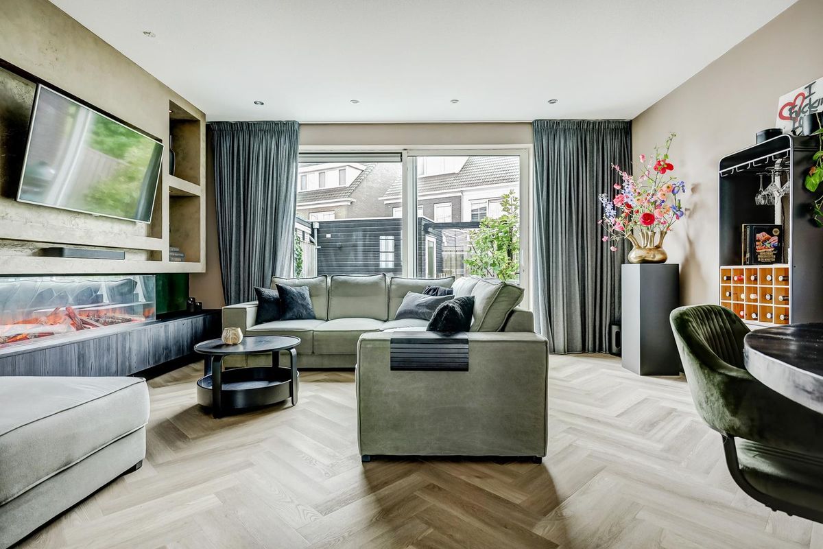 Ruime woonkamer met veel lichtinval door de grote schuifpui aan tuinzijde. Net als de overige ruimtes op de begane grond is de woonkamer voorzien van een mooie PVC-vloer met vloerverwarming; heerlijk! Daarnaast is er een Cinewall met sierhaard gecreëerd, wat de woonkamer extra sfeer geeft. De woonkamer is beschikt over een trapkast. De strakke wanden zijn voorzien van renovlies en het plafond is afgewerkt met spuitwerk en inbouwverlichting.