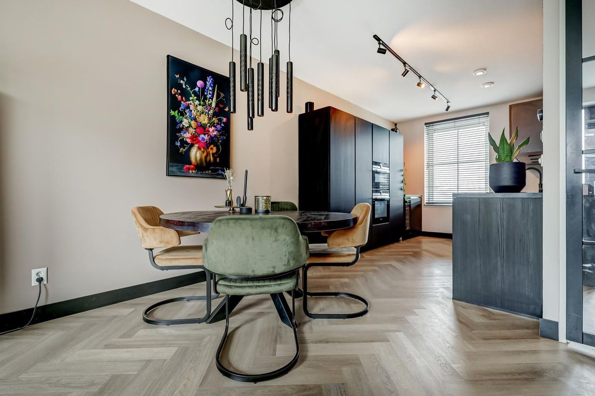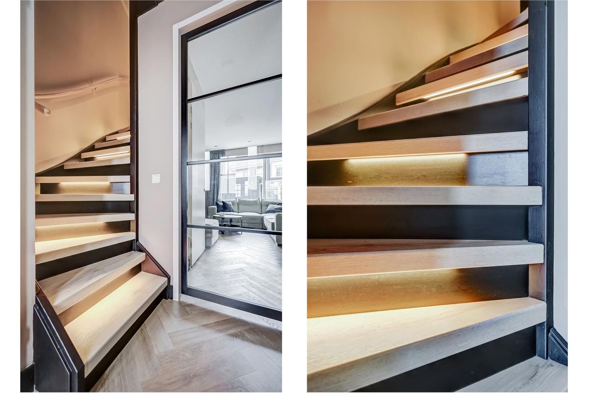 L-vormige hal met garderoberuimte, meterkast (6 groepen, kookgroep en dubbele aardlekschakelaar), een mooie PVC-vloer met vloerverwarming en strakke wanden (renovlies). De trapopgang is gemoderniseerd met PVC en heeft verlichting onder de treden, wat een luxe uitstraling geeft. Dit in combinatie met de fraaie zwarte deur met glas naar de woonkamer, geeft de moderne uitstraling van deze woning goed weer!