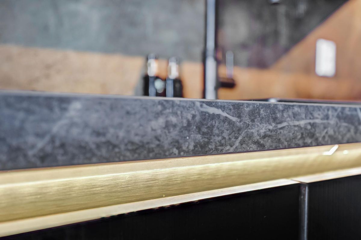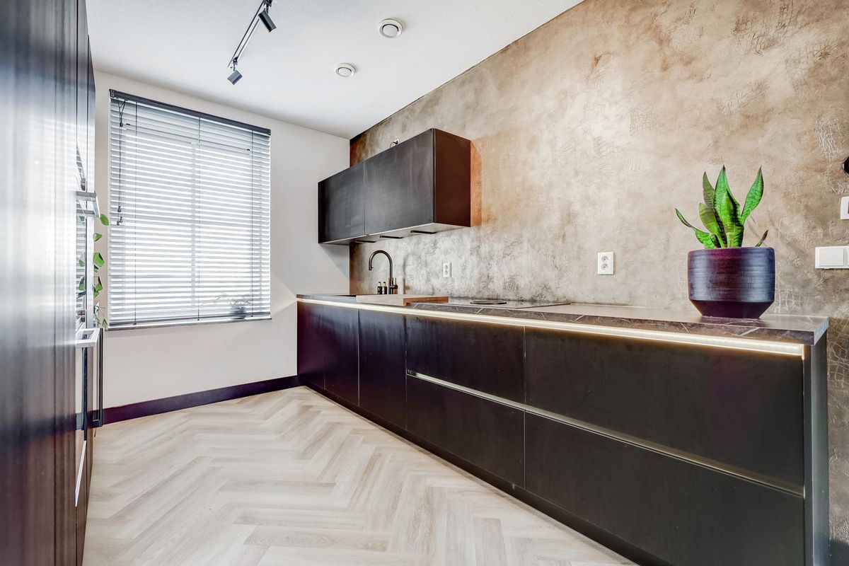 Aan de voorzijde van de woning treft men de grote, open keukenruimte die is ingericht met een in parallelle opstelling geplaatst keukenblok uit 2023. De keuken heeft een moderne uitstraling en heeft een zwarte houtlook kleur met een gemêleerd antraciet werkblad waaronder verlichting is geplaatst. Een plaatje!